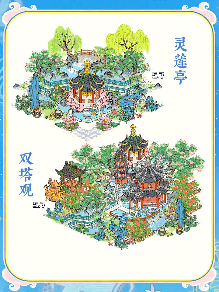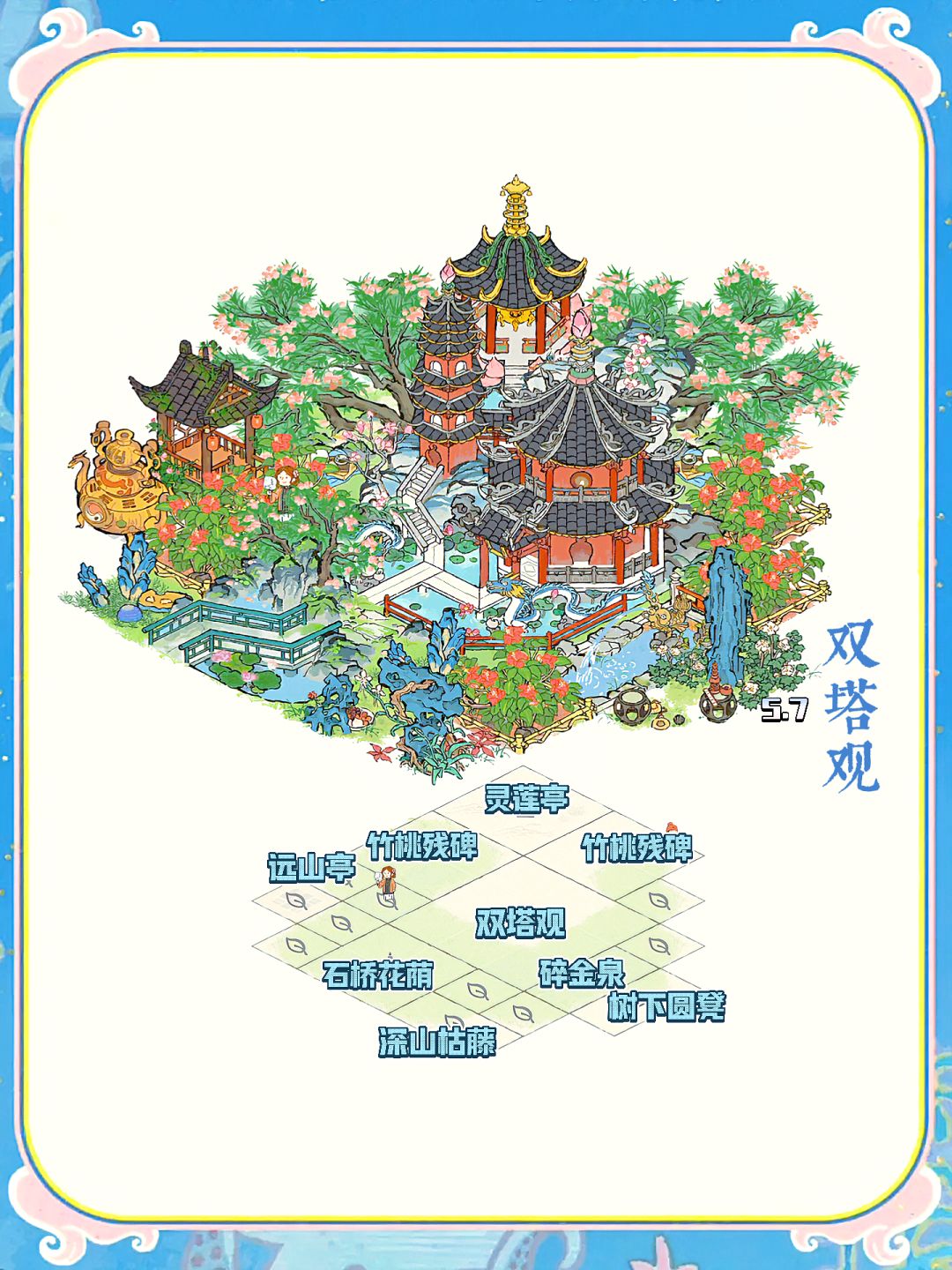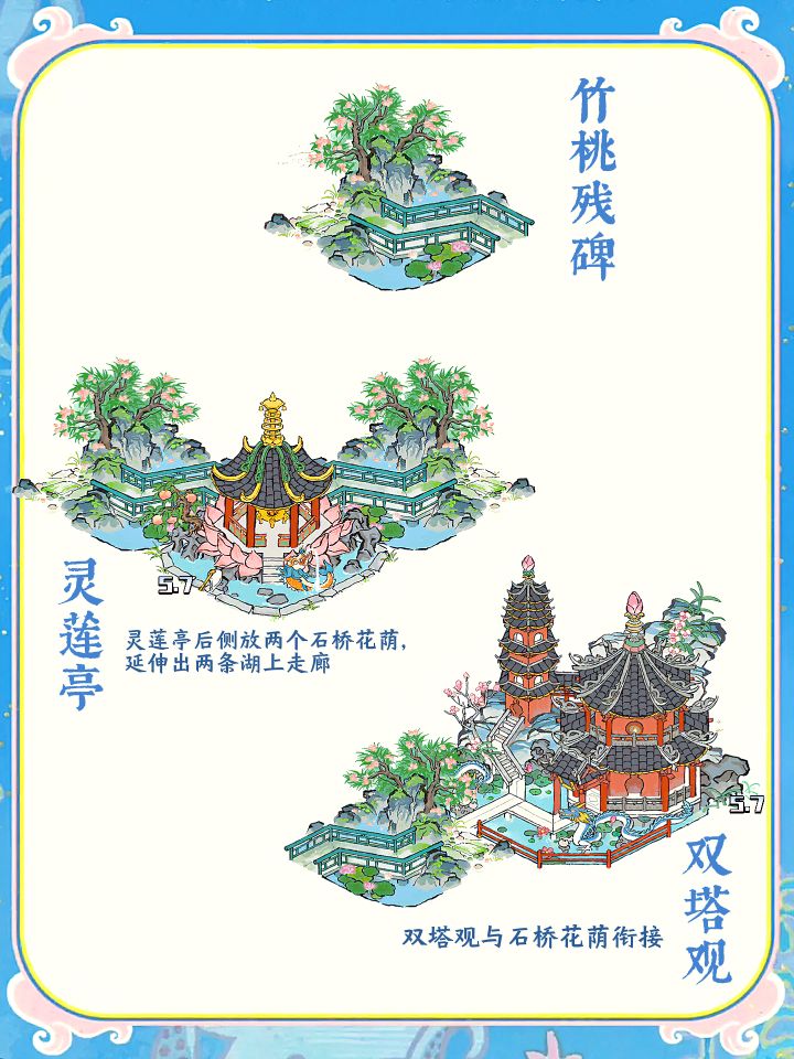 建筑:石桥花荫、竹桃残碑、双塔观、灵莲亭、璧泉垂