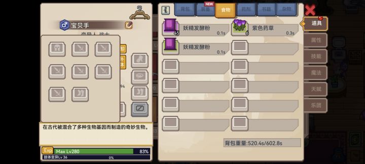 合肢体真的很懵逼,帖子还是太老了,现在不用马看基因,直接看天赋有没有带基因,一级没有后面升满36级还有可能会生成肢体基因,然后我也没用小鬼补全,直接就是孵出来一只一级带手基因的变异人,然后和三只带手基因的伊思合成,顺带着升过了36级,合出这个样子来。