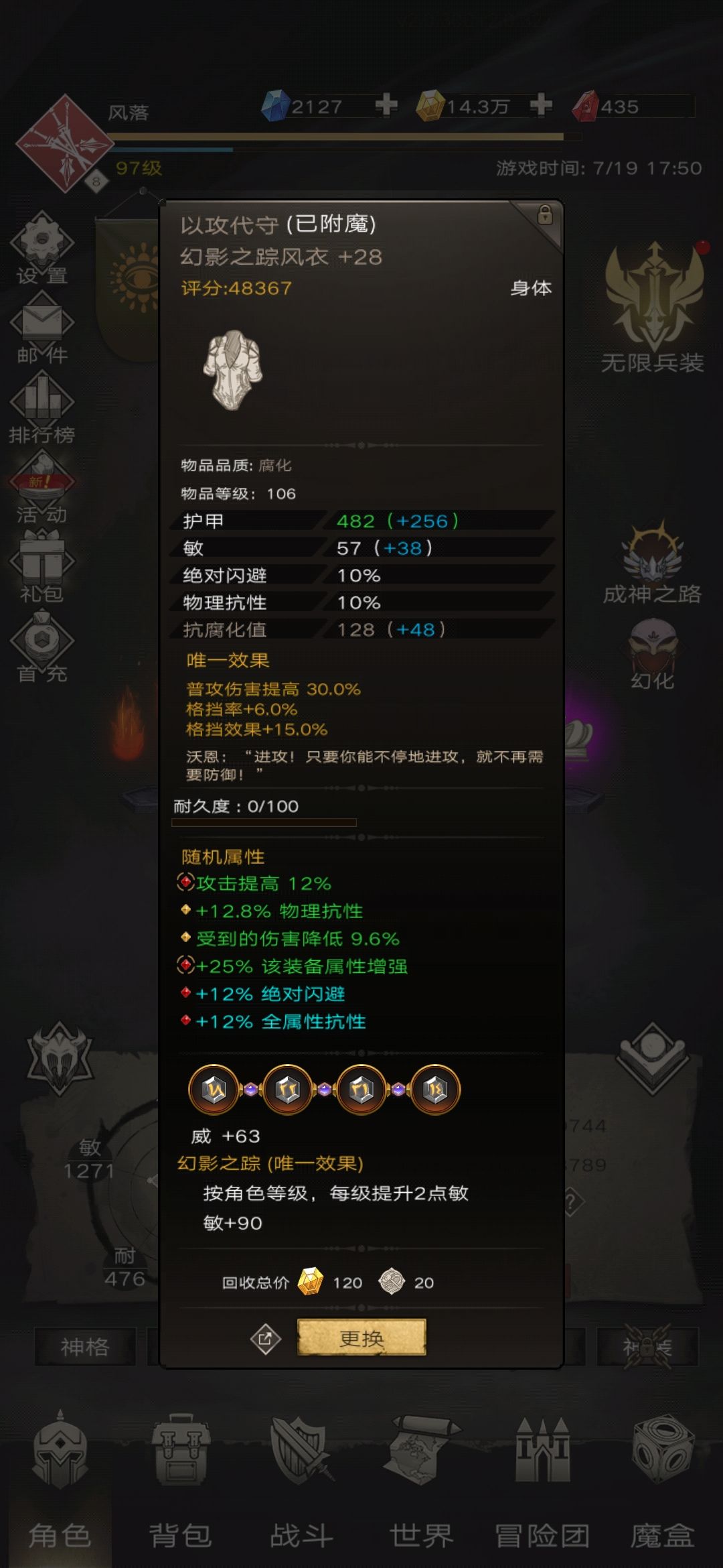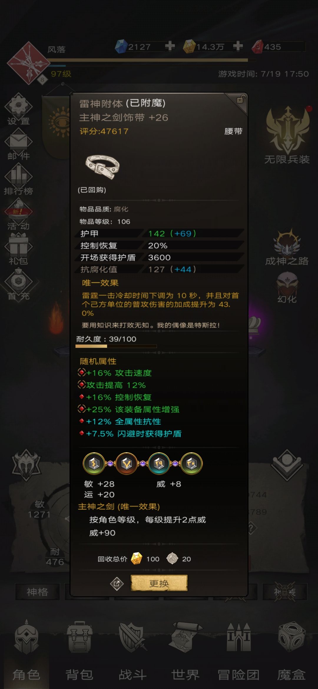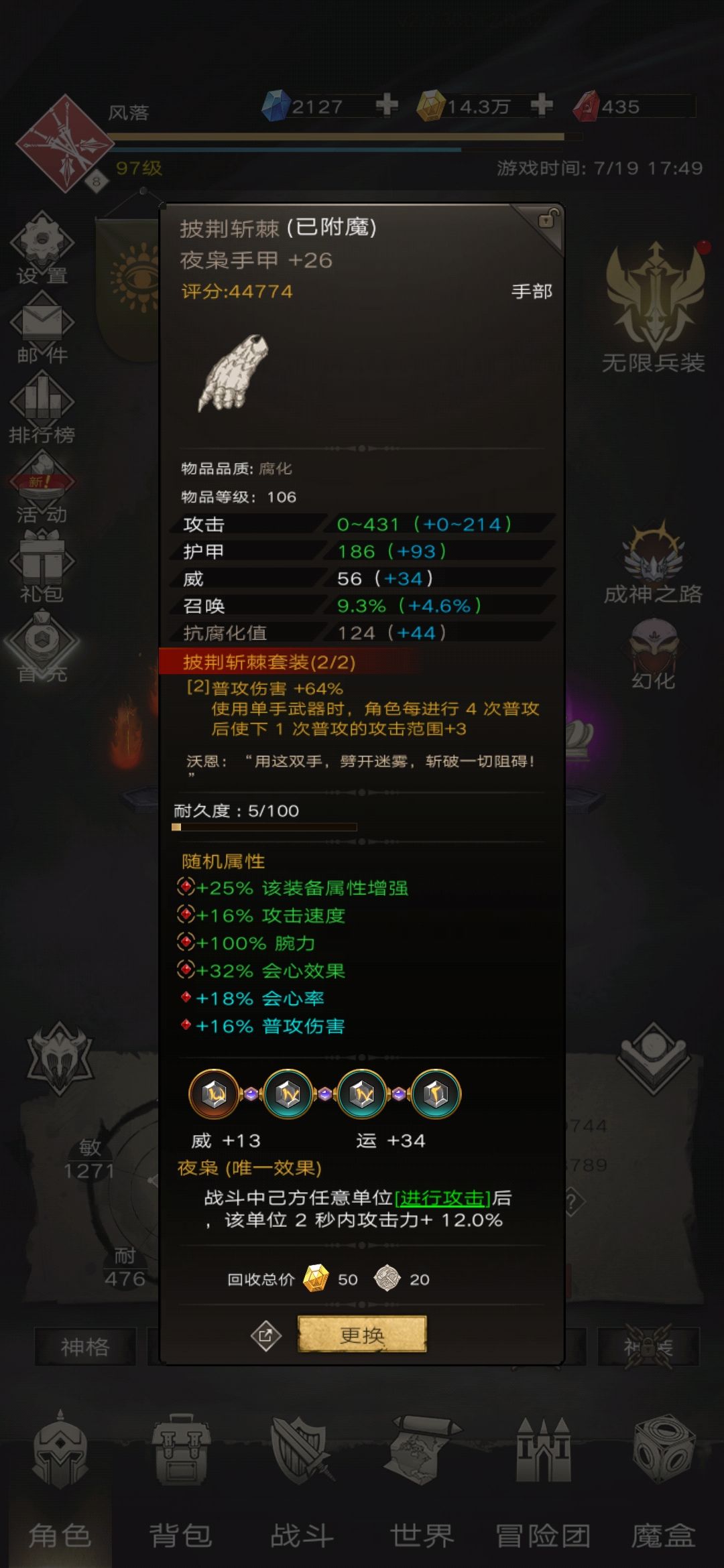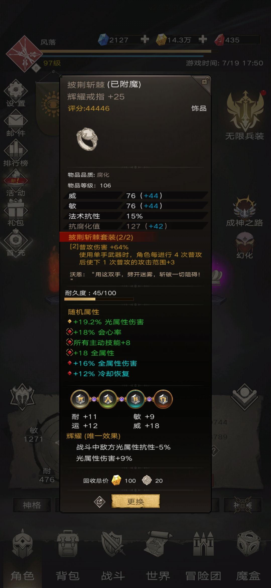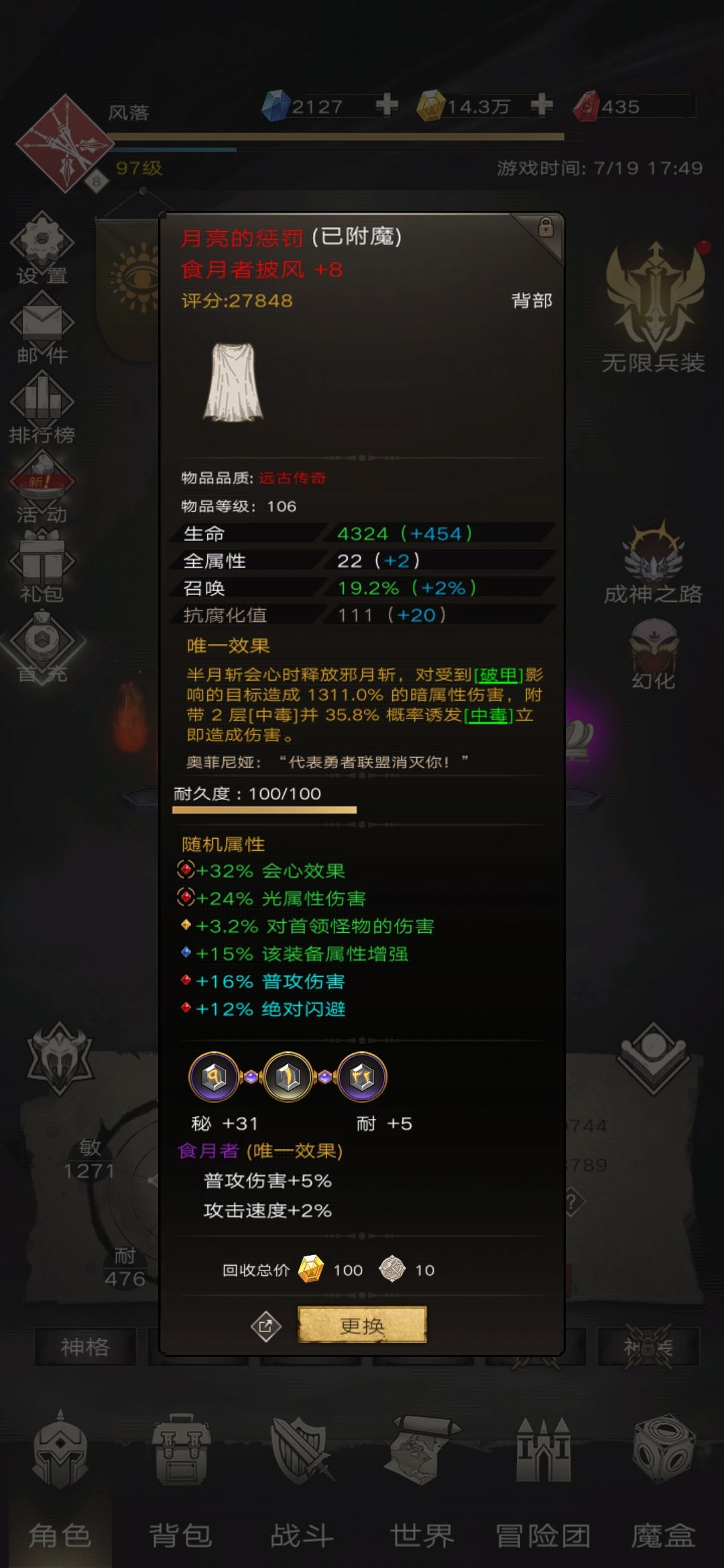 97级,刷万神时出了个升华黄披风,能打过T46了。之后打了个红披风,不过仍卡T47,腐化太低。