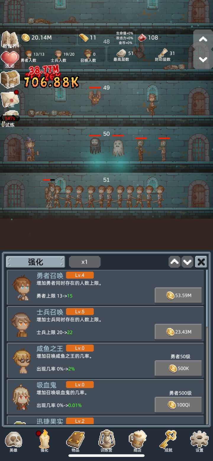 游戏里爬到100层能解锁轮回转生,可以获得永久加成,从1层重新开始爬塔。