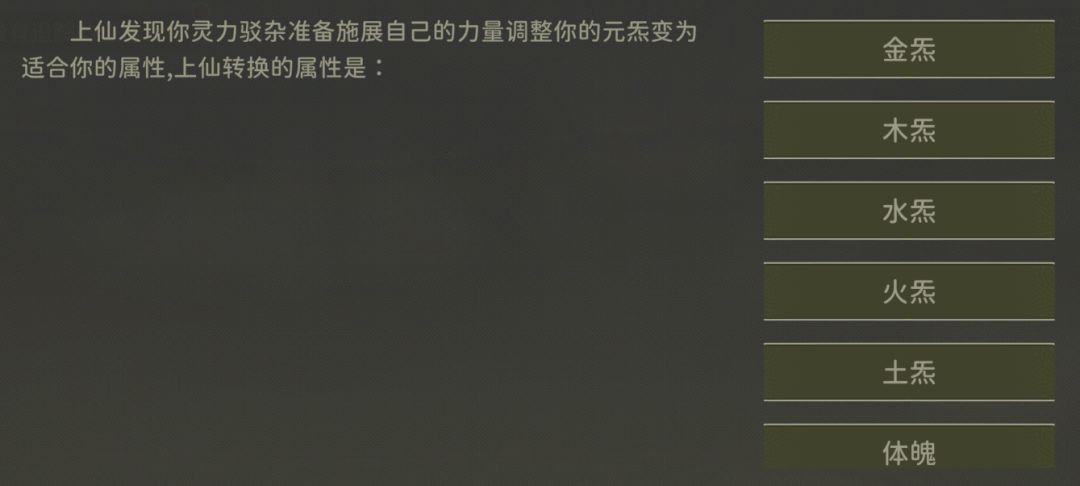 没有“x灵体”天赋效果的情况下,我们可以参考开局的仙人指路。领完乾坤袋(一切开局都选乾坤袋)以后,仙人会为角色转化修为主属性(如图)。但是如果有玩过游戏,你会发现很多时候没有灵体的情况,上仙转化的属性都会被带偏。那是因为下图中仙人的转化只是给你选择的属性+5,如果你没有灵体天赋也没有其它属性天赋,那么你选择的属性就会成为你的主属性。