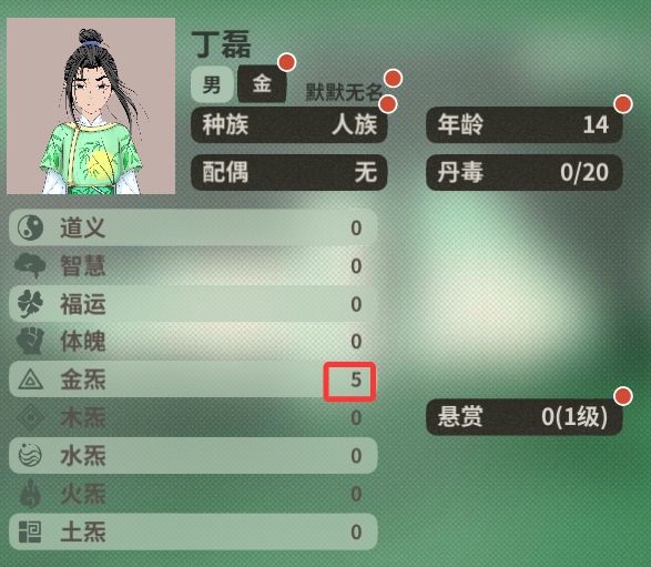 以金属性为例。选择“金炁”之后,角色的面板里主属性为金,可以看到详细属性当中体魄与其它灵气为0,唯独金是5。