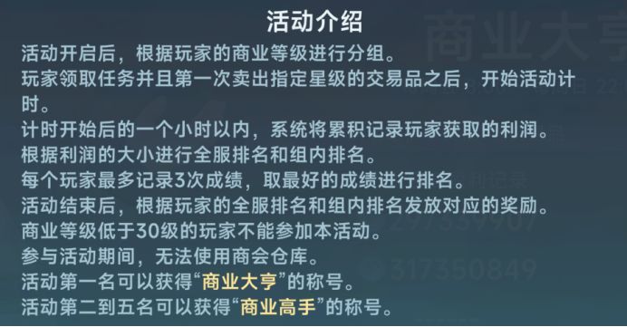 活动开启后,根据玩家的商业等级进行分组。玩家领取任务并且第一次卖出指定星级的交易品之后,开始活动计时。(注:就是说接了大亨任务只要不卖指定星级的货,就不计时。)