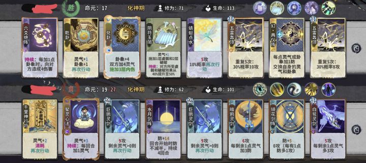 至于过渡,如图所示,完全不会过渡,上化神已经快死了就不现丑了。大致就是,金鸡是非常好的过渡牌,尽可能留着,在卦象充足的情况下,金鸡独立攻防一体,数值很美。