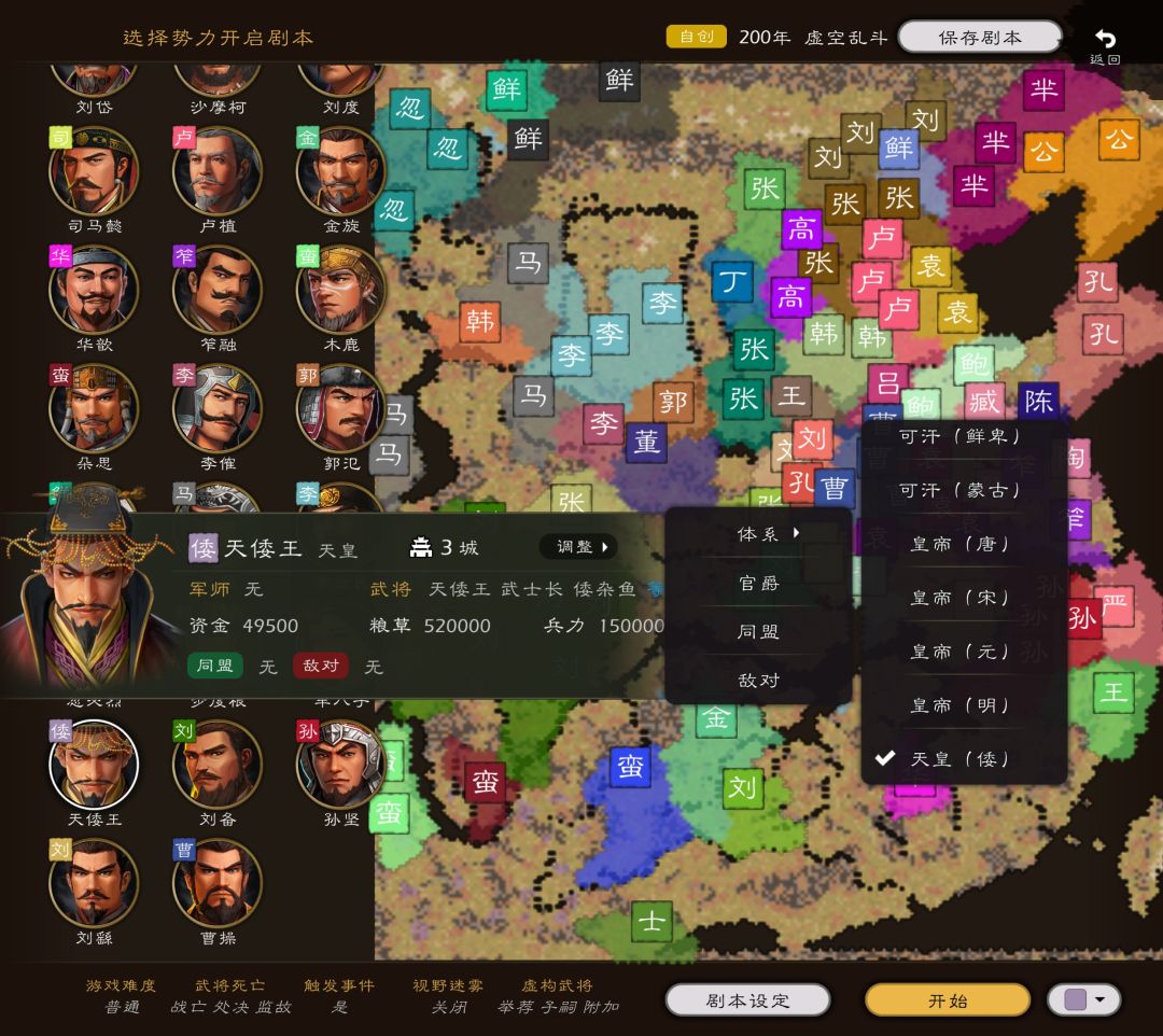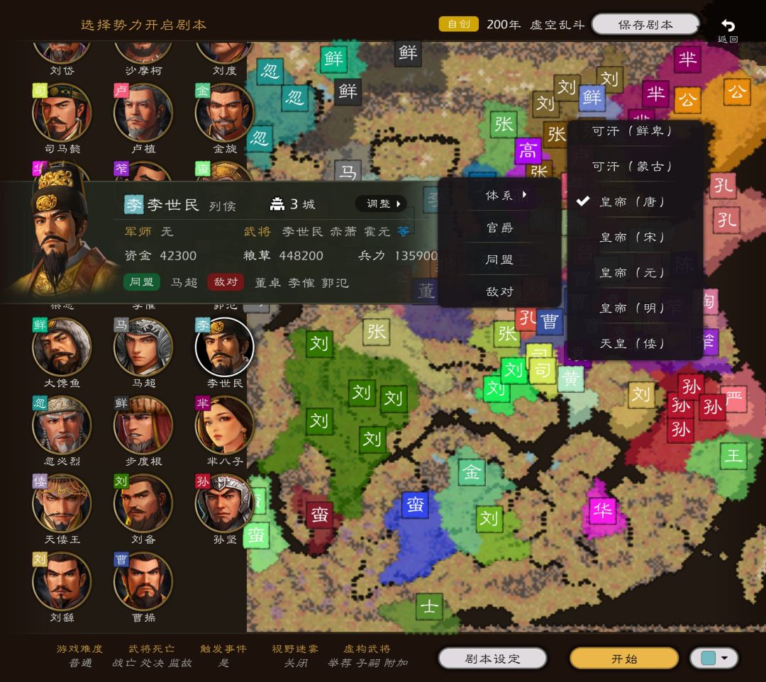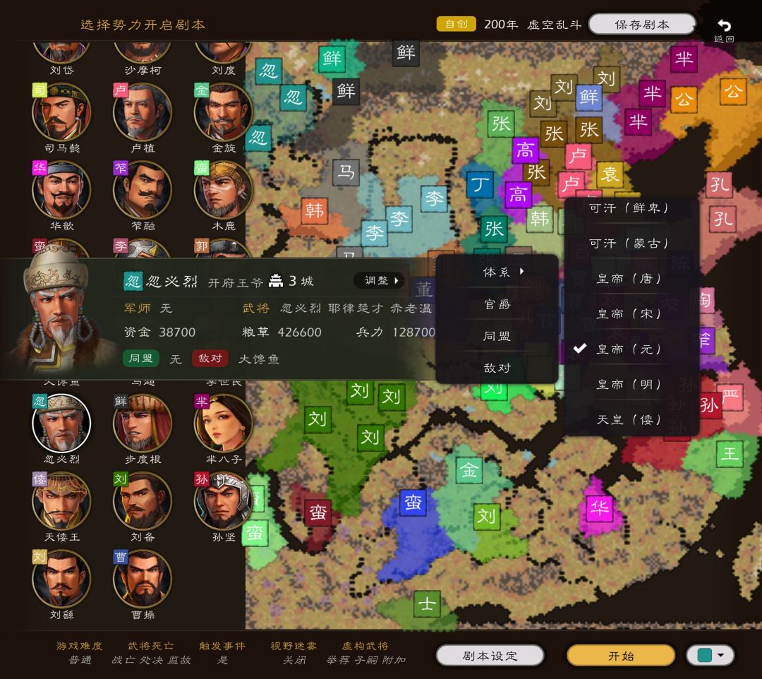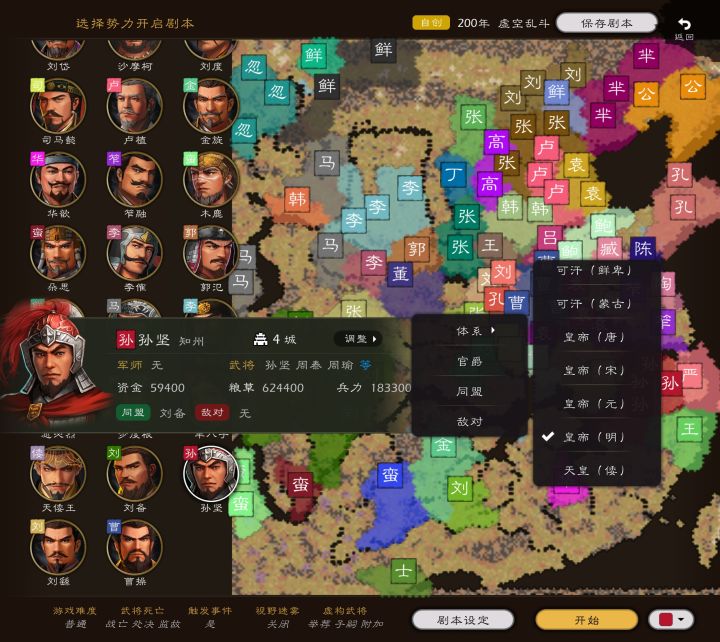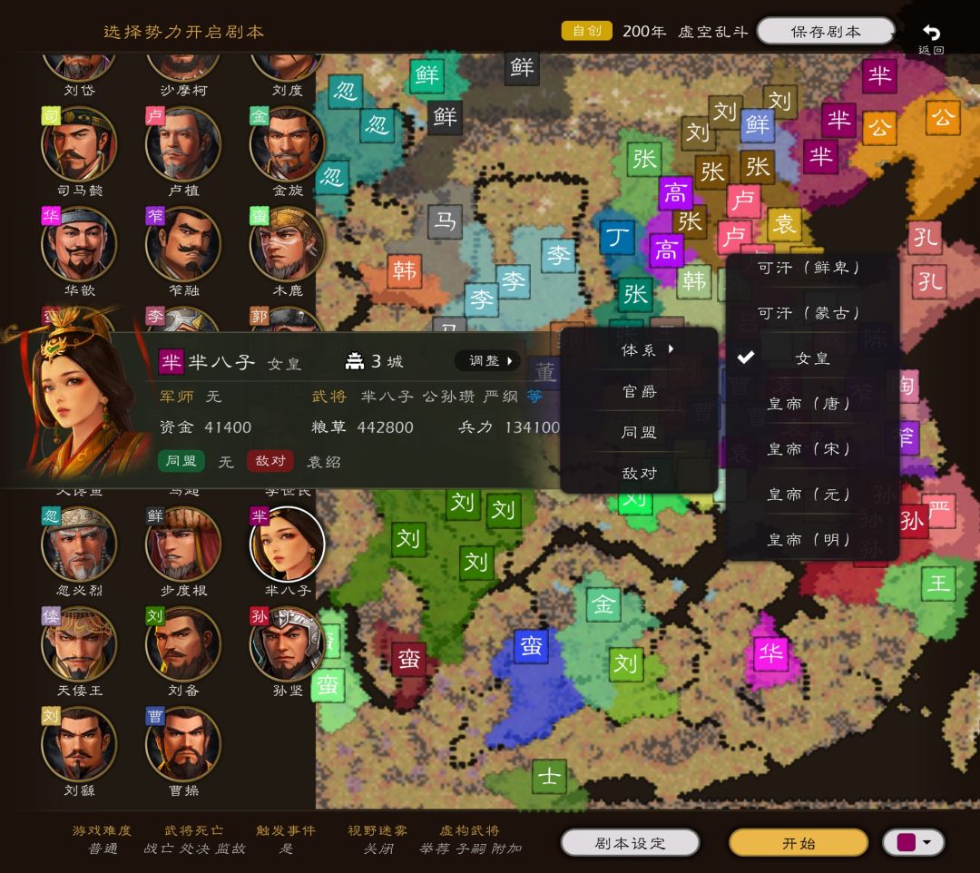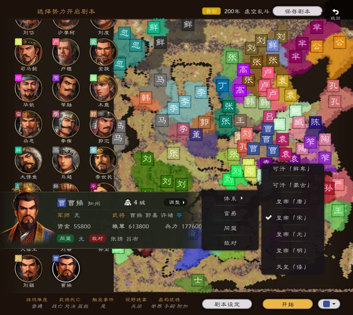 #需要全dlc,这个剧本里曹老板cos宋朝有自建岳飞,孙坚cos明朝有自建戚继光,加入了自建的忽必烈元朝有自建成吉思汗等元将,还有太宗李世民有一些自建唐朝名臣武将,加入了倭寇有一些日本战国名将,芈八子代替原公孙瓒为女皇有一众dlc女将加dlc公孙瓒部下,其他dlc的武将也分了各自势力,刘皇叔有神关神马神赵版本t0