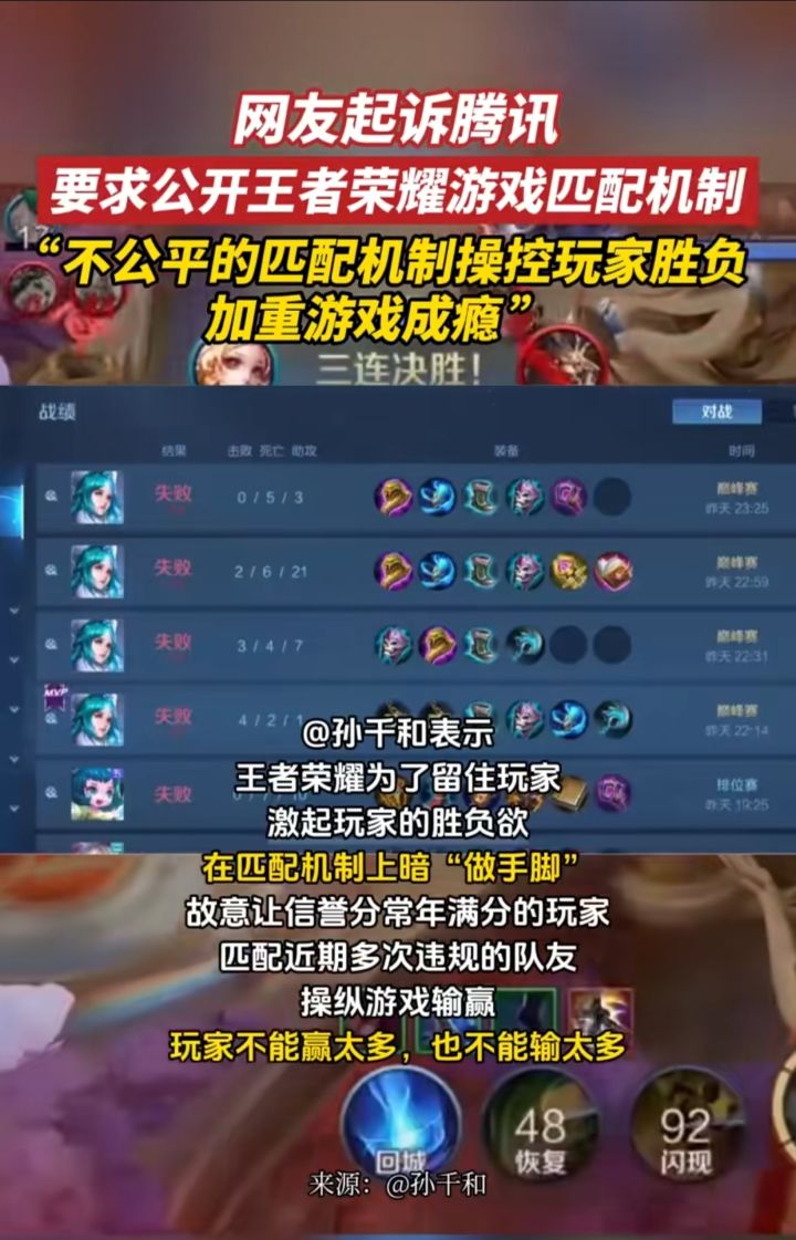 《王者荣耀》的匹配机制,一直是玩家热议的焦点。最近,有网友@孙千和 直接起诉腾讯,要求公开匹配机制,这事儿可闹大啦!