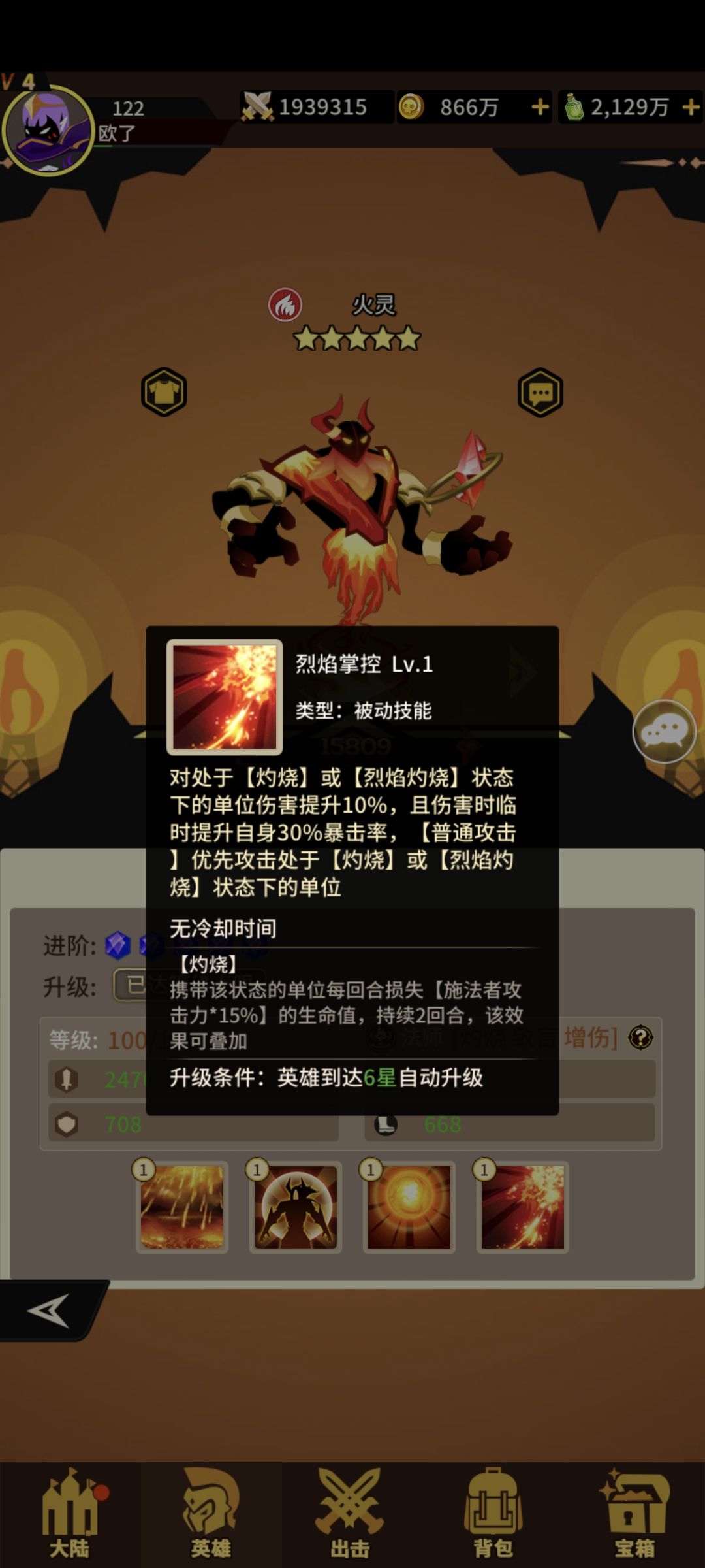 火系四技能法师!获取难度一般!抽卡+宝箱+兑换!一技能打三个概率+灼烧(每回合损失生命)二技能+攻击+生命 三技能打三个敌人概率+致盲(携带该印记命中降低)优先打带灼烧或烈焰灼烧状态敌人! 四技能 对灼烧烈焰灼烧的敌人增加伤害且伤害时增加暴击!普攻也是优先打灼烧和烈焰灼烧的敌人!