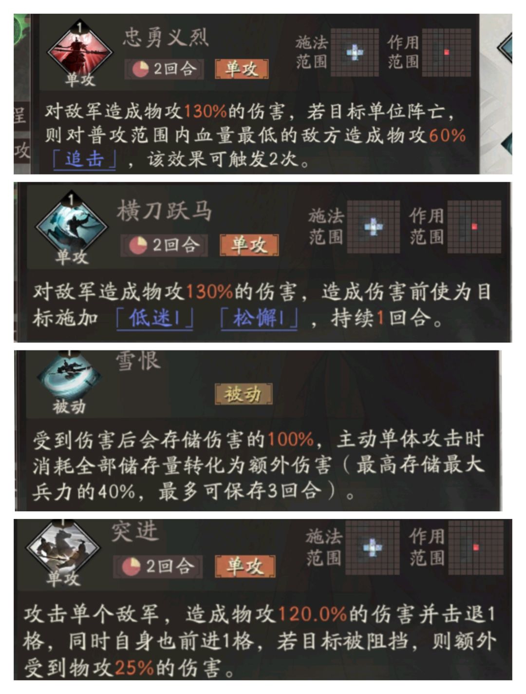技能选择:骑兵路线的忠勇义烈无疑是收割神技,且两回合的冷却让容错率大大增加。但在前期未解锁此技能甚至只有两个技能栏的时候我推荐一个技能选择雪恨,另一个可以视情况选择横刀跃马或者突进。前者能降低对手攻击并附加易伤,后者的强制位移在某些地形会更大的效果。