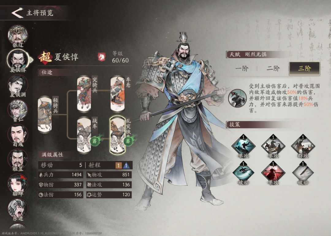 分支选择:由于攻击是范围机制,所以我们的加点毫无疑问的也必须选择战车,因为战车攻击范围是九宫格,而骑兵只有十字格。牺牲一点的移动来换取攻击范围对夏侯惇来说无疑是必选项。