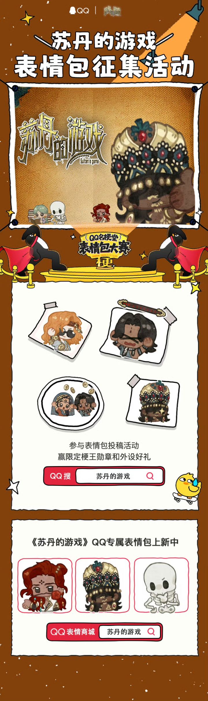 快去QQ搜索《苏丹的游戏》官方频道,发出你珍藏已久的梗图,参与表情包投稿比赛吧,赢取梗王勋章和外设好礼。