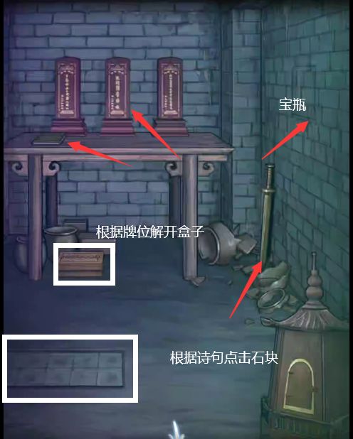 13.进入洞内,墙边有一把剑,根据中间牌位“天地国亲师之位”将桌下的密码盒按照顺序重新排列,获得粘合剂,根据桌上本子上写的诗,按照顺序诗句点击地上的砖块,右边墙上就会获得一个宝瓶。