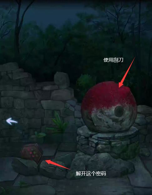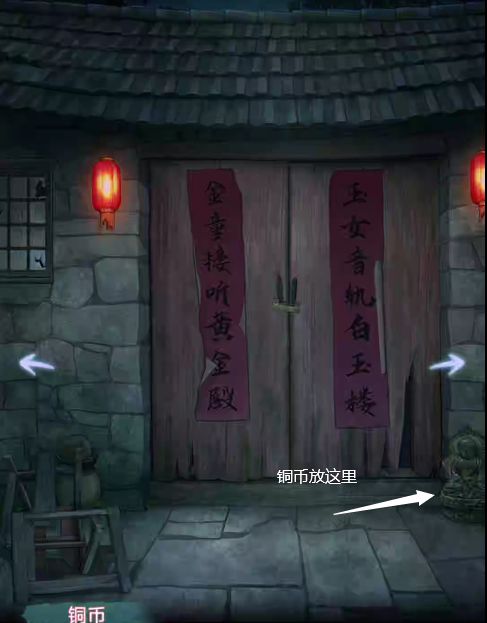 使用刮刀在大门左边刮下朱砂,可看见朱砂下面有五个红点,根据这个线索可解开朱砂下的盒子,获得铜币。