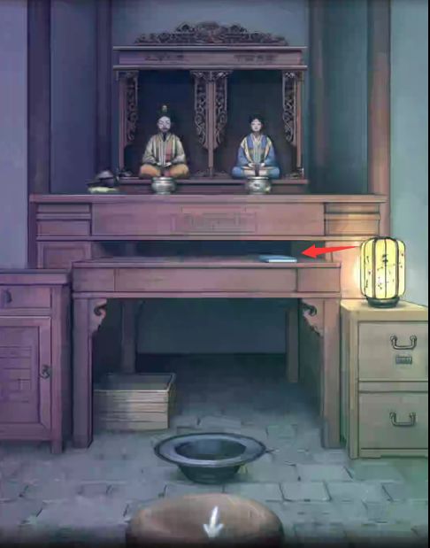 6.把冥钱给母女俩,获得挽联纸,桌上有一根毛笔,把纸放在桌上,写下挽联再递给母女,获得手镐,使用手镐敲开厢房外墙上的泥土,获得另外一只手,安装在佛像上,获得另半个镶嵌物,将其安装在地面上。