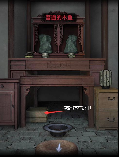 9.将军庙,左下角可找到一根铁丝,中间蒲团地下有一颗圆珠,武器架上有木棍,木棍和链子组合颗获得长木棍,使用长木棍勾下右上角的大红花,将大红花戴在马的脖子上,解开马脖子上的密码可看见一个圆形的孔,将小圆球放上去,获得一个密码箱。