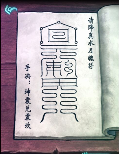 23.在室内使用朱砂沾水,再根据右边桌上的书本记载画出水火符(符咒内容在之前的书里,记不住的可直接看这篇帖子上的截图),用印香点燃火符,将其放进圆形火炉里,将水符扔进井里,获得一桶水,将其倒进方形鼎中,回到掐诀回到午时(这里我不清楚是否必须要掐诀,大家可以先试试看不掐诀能否进行,如果之前就拿到香了就不用),上香,敲木鱼,回到现实世界。