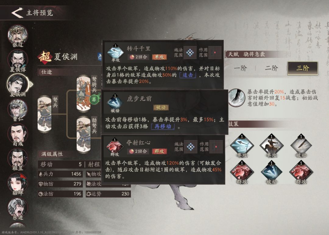 技能选择:实话说夏侯渊两个分支的被动技能都很强。但在前期资源不够的情况下,骑兵线的虎步无前性价比更高。毕竟就算你两条线都开通,在前期只有两个技能栏的情况下,你也不可能把两个技能全放成被动。