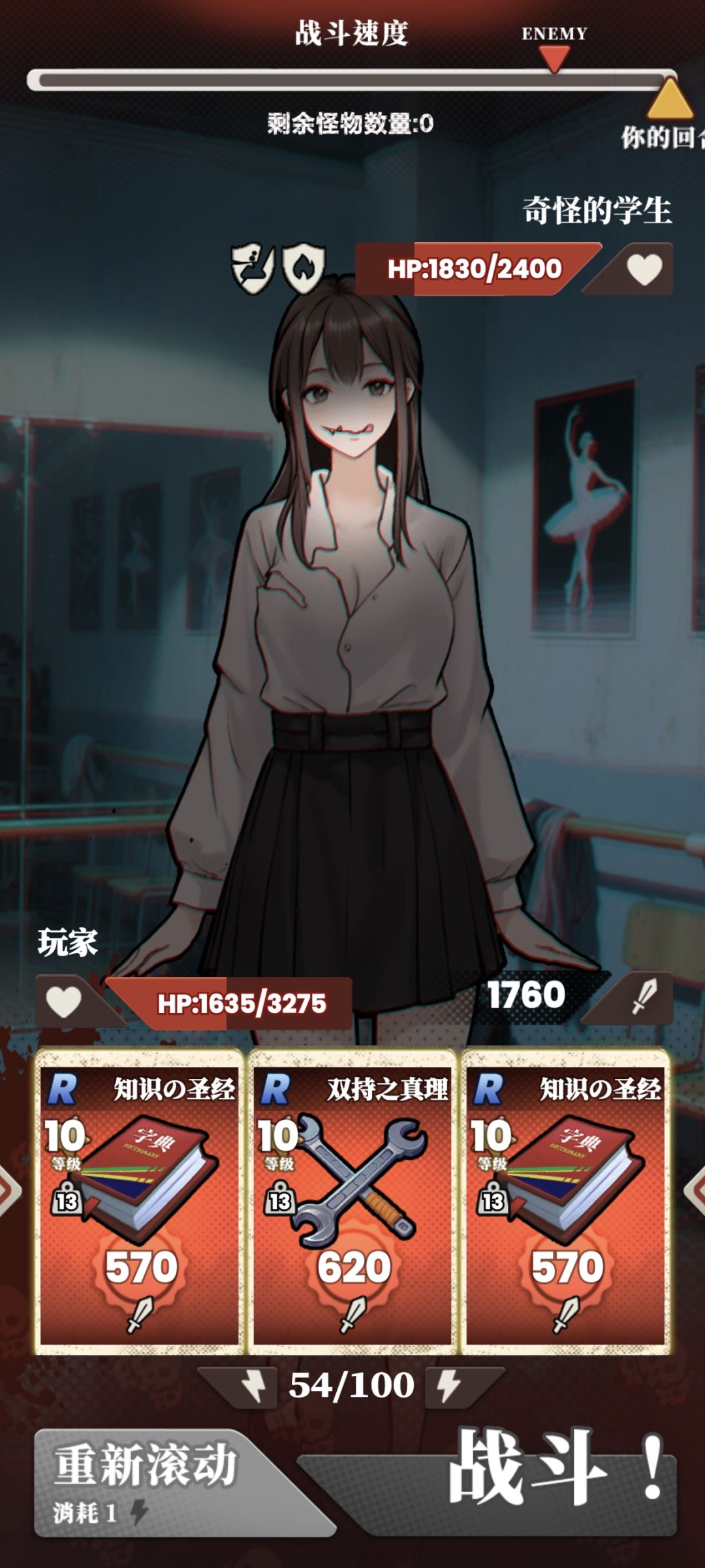 先上装备图(图1),配装思路差不多的,如果有sr护具和药先上sr的(护具比起头盔更推荐球鞋,因为更轻),注意一个攻击一个防具一个治疗剩下俩是通用,通用,别想用速度压,你压到24重量也跑不过某些女鬼的(图2,3)……血量回复比吸血要猛,因为不强化也就吸那么点,但是回血不一样,两个回血可以回一千多,哪怕一个回血一个护甲也比吸血要强,可以慢慢耗,反正也没代价。buff取等级高的,所以可以触底加体育(奶茶),虽然我是推荐越轻越好,但是……R级太轻打不出伤害,如果嫌重可以通用带俩回血,然后扳手慢慢耗就行(图4,5),觉得看看血决定自己roll不roll牌,反正我没roll也这样过了……反正我是没想到R三红能打5280的(图6)