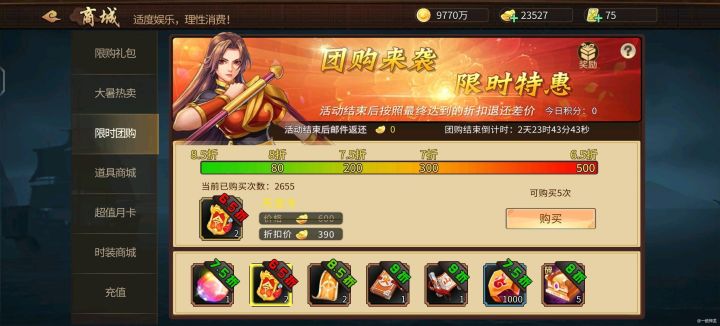至于团购里最划算的还是天龙令啊,元宝折扣直接购买虽然限制了次数不过还是存着一些有备无患更好,以后可以等次数够了的时候随时抽武将出来的感觉还是很好的。而且反正限制次数购买也花不了很多元宝。
