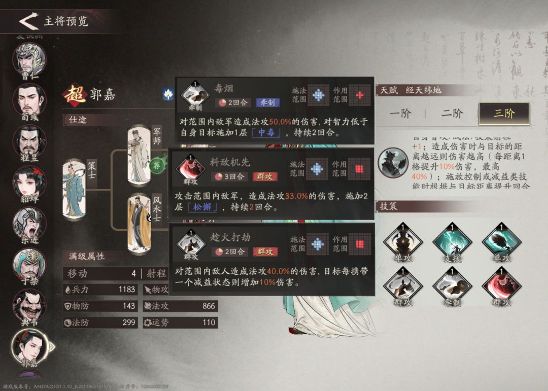 2.另一个则是群攻异常派,推荐料敌先机,趁火打劫和毒烟。这个技能流派更加适配郭嘉的天赋。但核心输出趁火打劫需要能附加异常状态的队友增加伤害。两种流派各有优劣。
