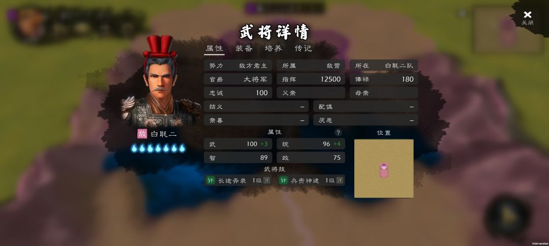 首先出场的是工具人【白毦兵】2号,兵力12500,武力100+3,攻击60,无装备,攻击无兵种克制,无视【先制】,完美工具人![[表情_开心]](https://img-tc.tapimg.com/market/images/48516f625646b5ea2c66f0cab3c9c52a.png)