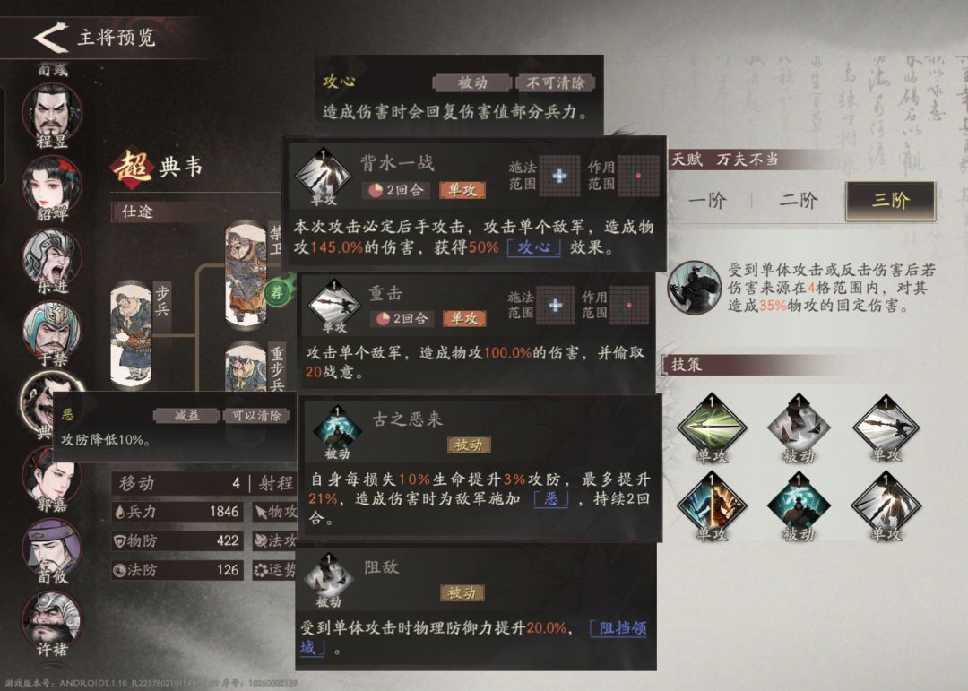 技能推荐:资源足够的话,在前期可以把重步兵线也点开,折冲御敌这个技能在前期主将不全时功能性还是比较好的。前期推荐折冲御敌和重击。在后期没有辅助位或生存压力大时推荐阻敌,古之恶来,背水一战。而在生存压力小或者有护盾类辅助帮忙控血时推荐古之恶来,阻敌和重击。