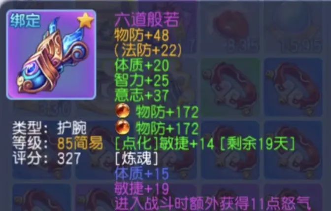 炼魂:炼魂体质+15、敏捷+19,数值稍低。特效进场加怒11,建议重新洗炼优化。