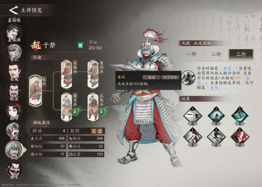 主将简介:合击是本游戏的核心机制之一,而于禁更是合击流的代表人物,只要攻击范围有合击,于禁多少得随一个,甚至随的一个还能合击。