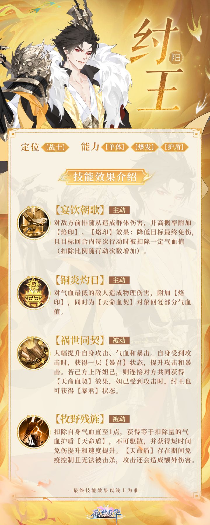 纣王可为自身施加抵挡控制效果的护盾,被攻击时可提高自身攻击和暴击。纣王技能攻击可施加负面状态【烙印】,使目标每次行动后损失一定气血。