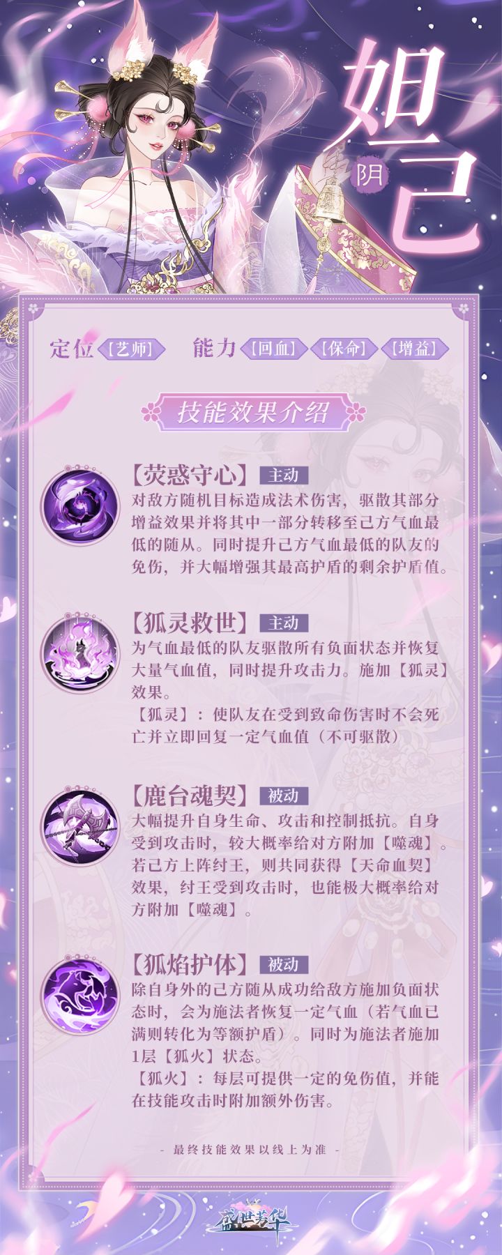 妲己可以驱散敌方的增益效果并转移给己方随从,还可施加专属状态【狐灵】保护队友避免1次阵亡,此外己方队友施加负面状态成功后可为其恢复少量气血并提高免伤。