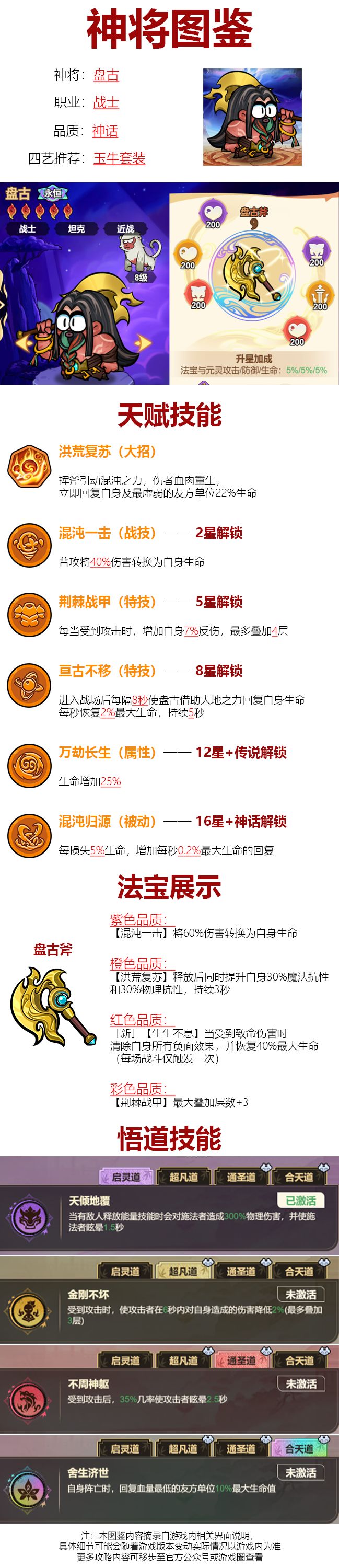 总结:针对共工祝融体系而出的一个前排,反伤面前终生平等。比刑天更高的抗伤比例(刑天7*2,盘古22*2),16星前刑天对比盘古可以说毫无优势,新晋的坦克一哥。