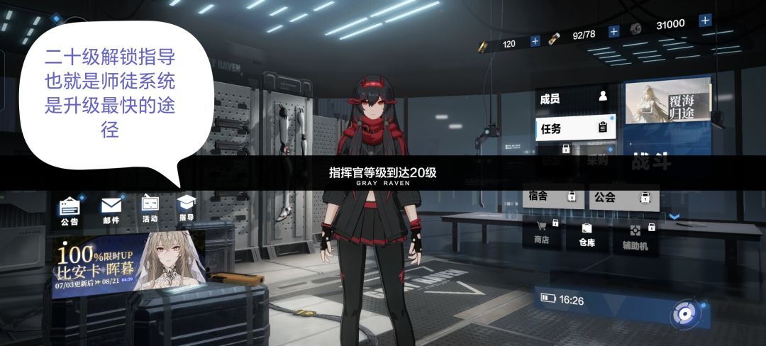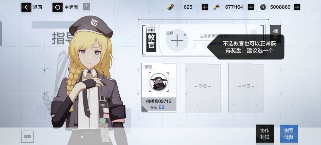 那么选完角色之后我们第一时间继续去打主线直接刷到20级也就能开启经验最多的指导系统,可以选择一位教官,教官的作用是给你答疑以及你完成任务之后,会送你五星意识碎片,当然箱子的奖励你不选教官也可以获得,选任务的时候尽量避免选择签到五天之类的,需要比较长时间才能完成的任务,