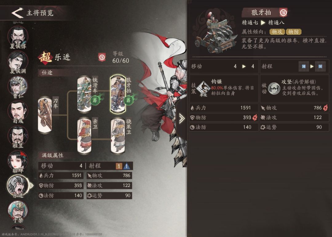 分支推荐:由于乐进的面板伤害不高,所以这里推荐选择物防更高的狼牙拍兵种。如果面对法攻偏多的关卡,可视情况切换为骁果卫。