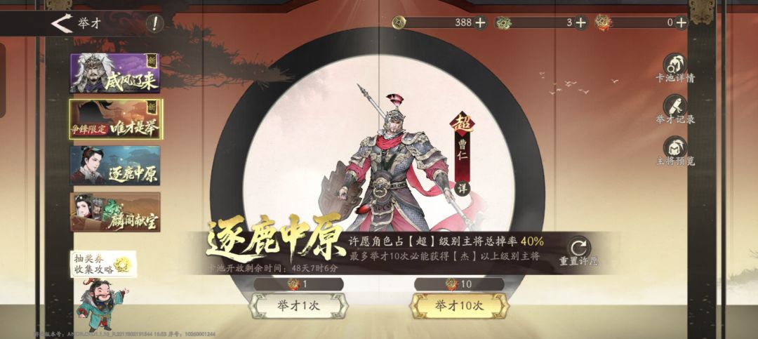 这次测试有唯才是举卡池,可以选择曹仁为许愿角色,加大概率。希望公测也有,然后加大一下概率,嘻嘻。