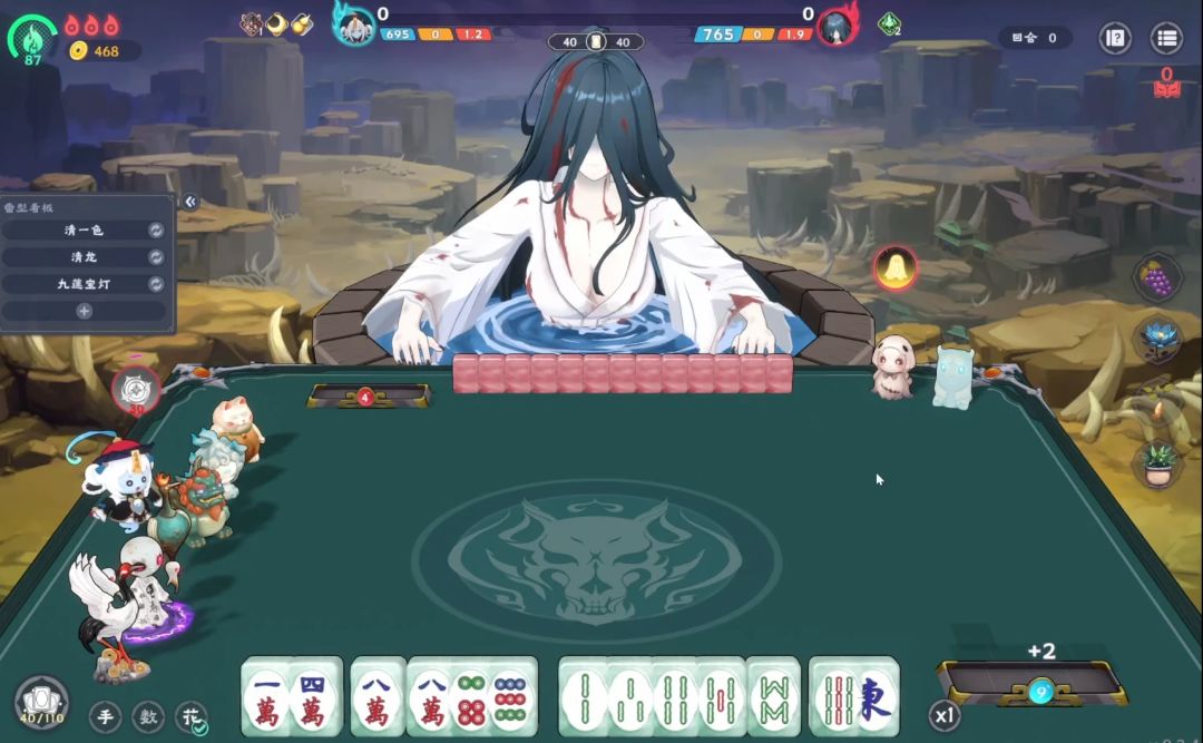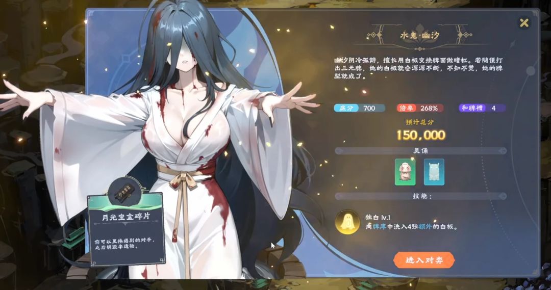 举个例子,游戏中的水鬼幽汐,专属能力与“白板”牌有关,不停增加额外白板,就有种水源源不断涌出的感觉。开场台词是:“输了,就下来陪我。”造型则是泡在井水中与我们打麻将。