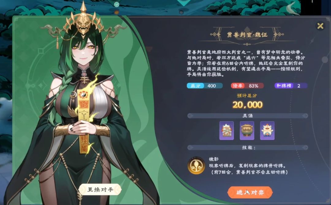 像四大判官中的魏征,他的两大特性,一个来自于《西游记》中的梦中斩杀龙王。如果双方达成“连六”等“龙”相关番型,双方得分皆为0——因为龙被魏征斩了。而他的主动特技:镜影,复制玩家的牌并听牌。则与李世民纳谏有关:“以镜为鉴可正衣冠,以史为鉴可知兴替,以人为鉴可知得失。”这就是很巧妙的历史、文化与麻将规则之间的关联了。