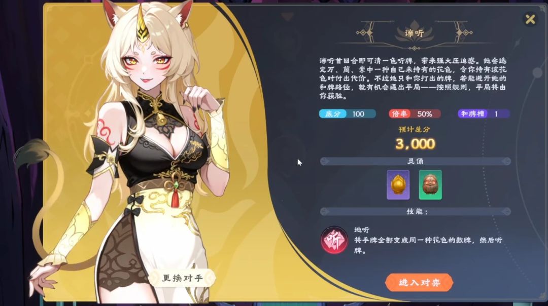 而像是谛听这个原本可以通过“听”来辨别世间万物的神兽,在《我地麻》中的能力,则变成了“开局就能听牌”。这种将麻将术语与地府角色特点相结合的双关设计非常巧妙,在《我地麻》中,也相当多。
