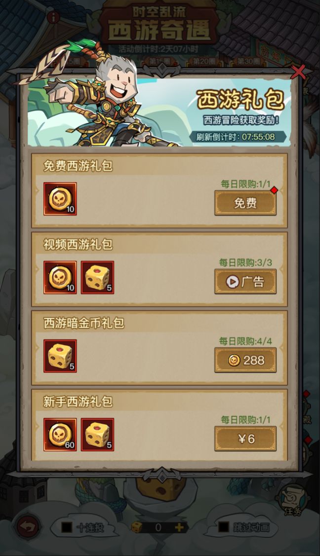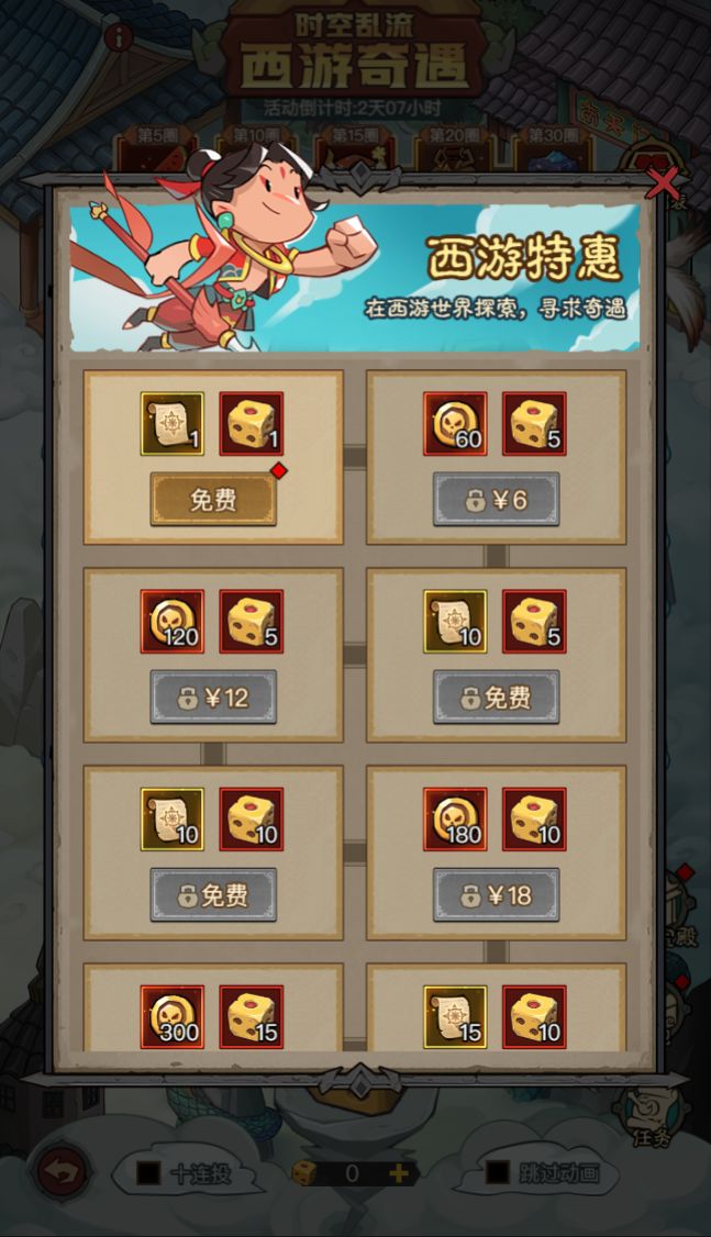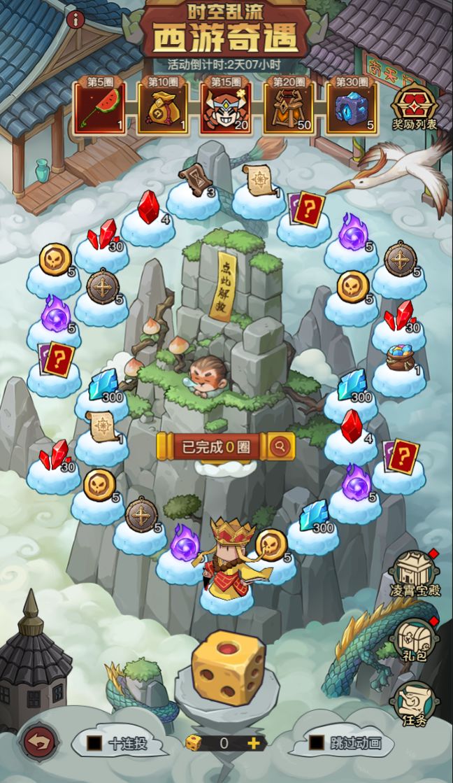 (1) 使用西游骰子进行投掷,根据投掷点数前进对应格数到达格子停止后获得格子上的奖励,并且格子等级提升(6个点数的投掷概率相同)。