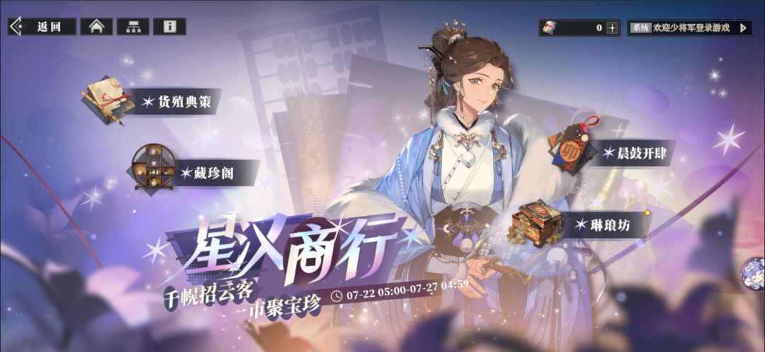 千幌招云客,一市聚宝珍!神秘老板丁夏开设的“星汉商行”将于7月22日05:00上线,少将军可通过星汉商行发行的特殊商票「丁氏契书」兑换星汉商行中的珍稀之物!完成每日签到以及日常任务,即可获得「丁氏契书」(此商票永久有效,即使本期星汉商行关闭也可自行保留)。本期星汉商行带来了「神霄石、无双三阶装备、七杀符、绝品风物自选包、自选阵营神将」等超值豪礼,一起来看看吧!