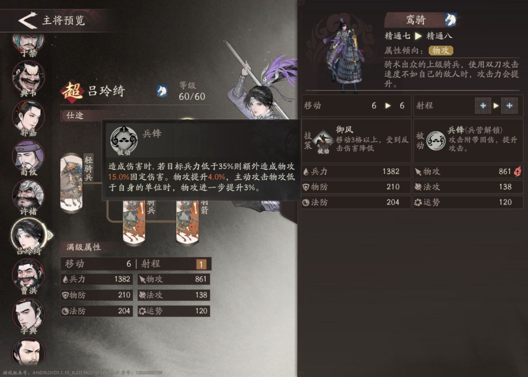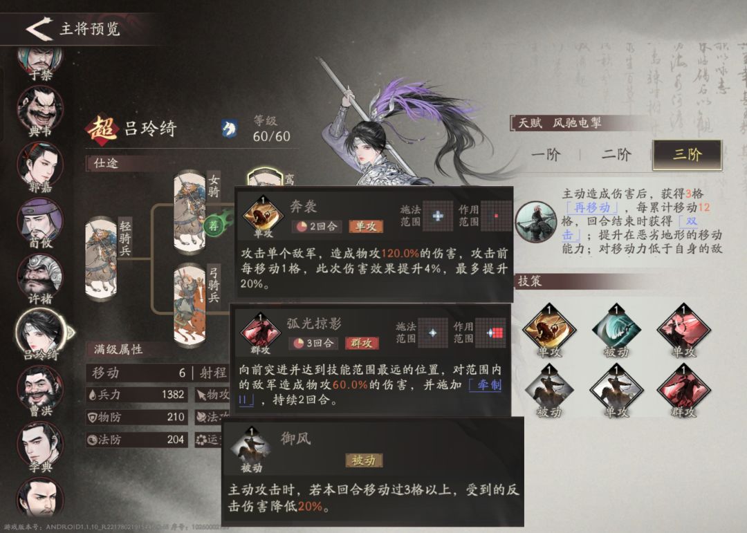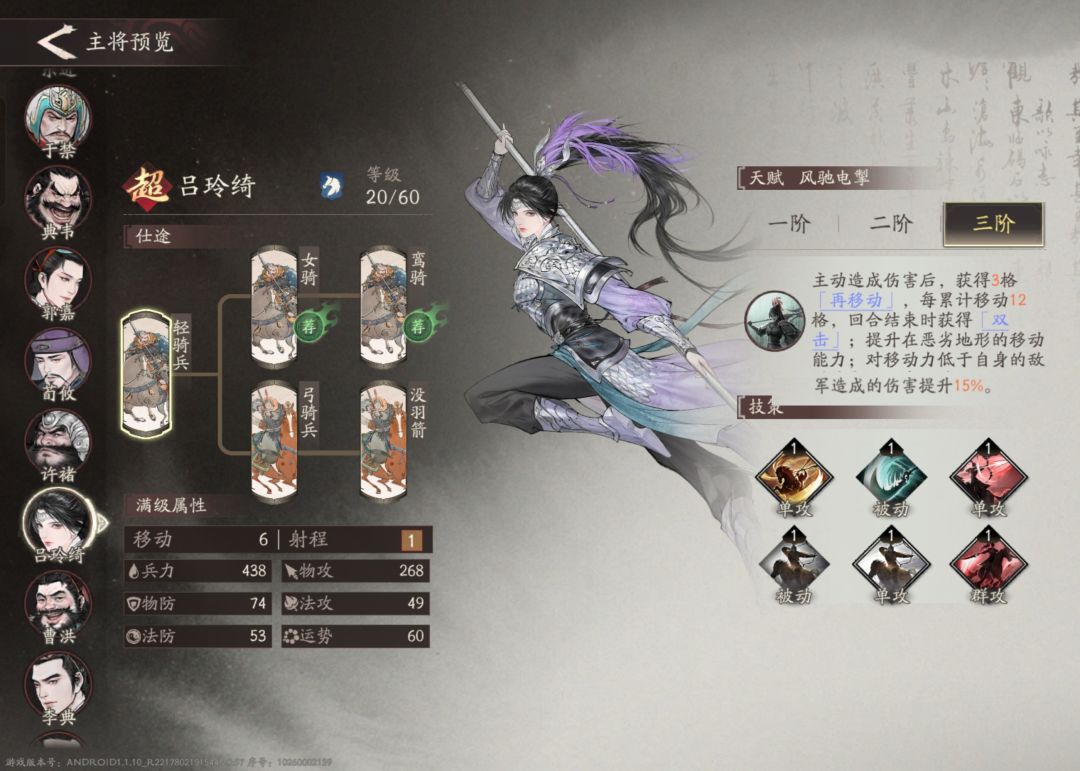 主将介绍:吕玲绮可以简单理解为近战的夏侯渊,同样依靠移动距离来增加伤害。此外移动十二次后还能攻击两次,并且对移动力低的敌人还有伤害加成,强度可见一斑。