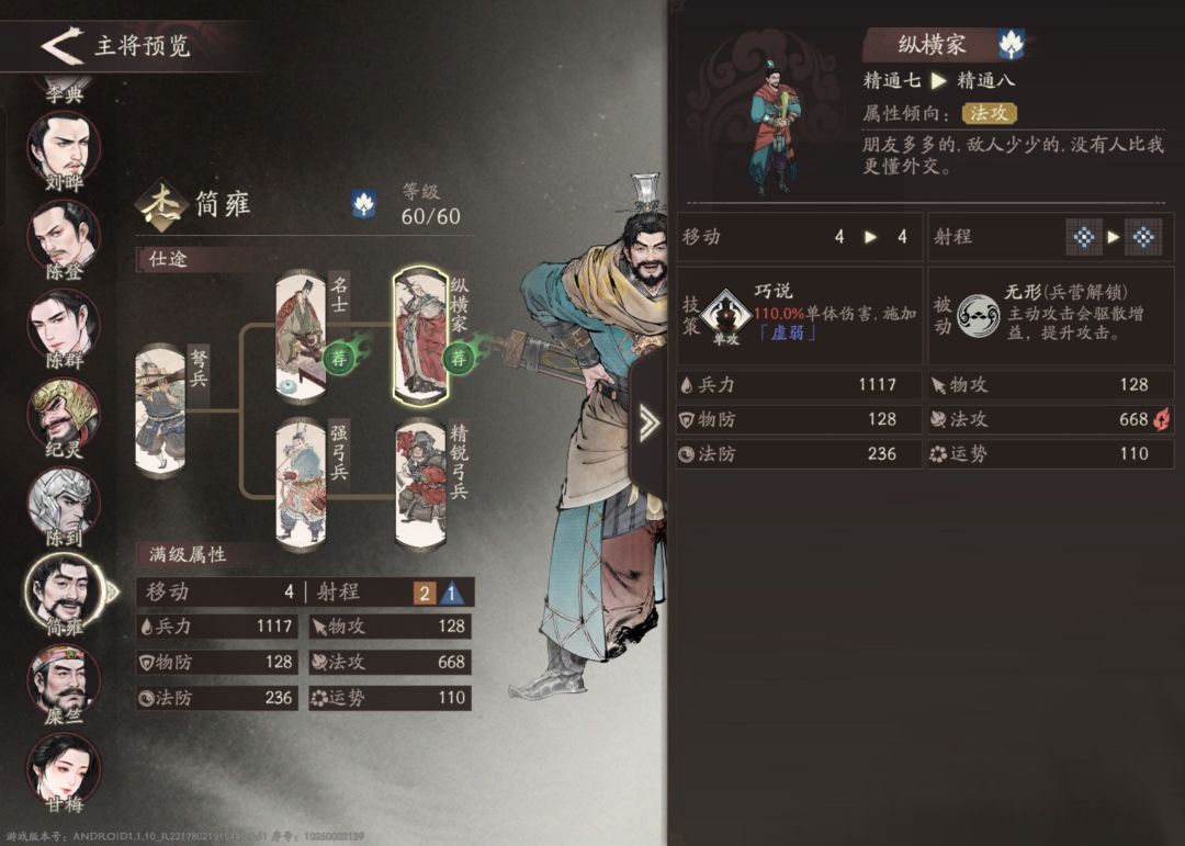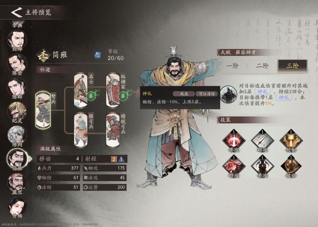总结:限制简雍强度的不是品级,而是他的倒戈不能像贾诩的反间计一样对将领使用。否则完全可以组建一支PVP,PVE强度都在线的法师大军。