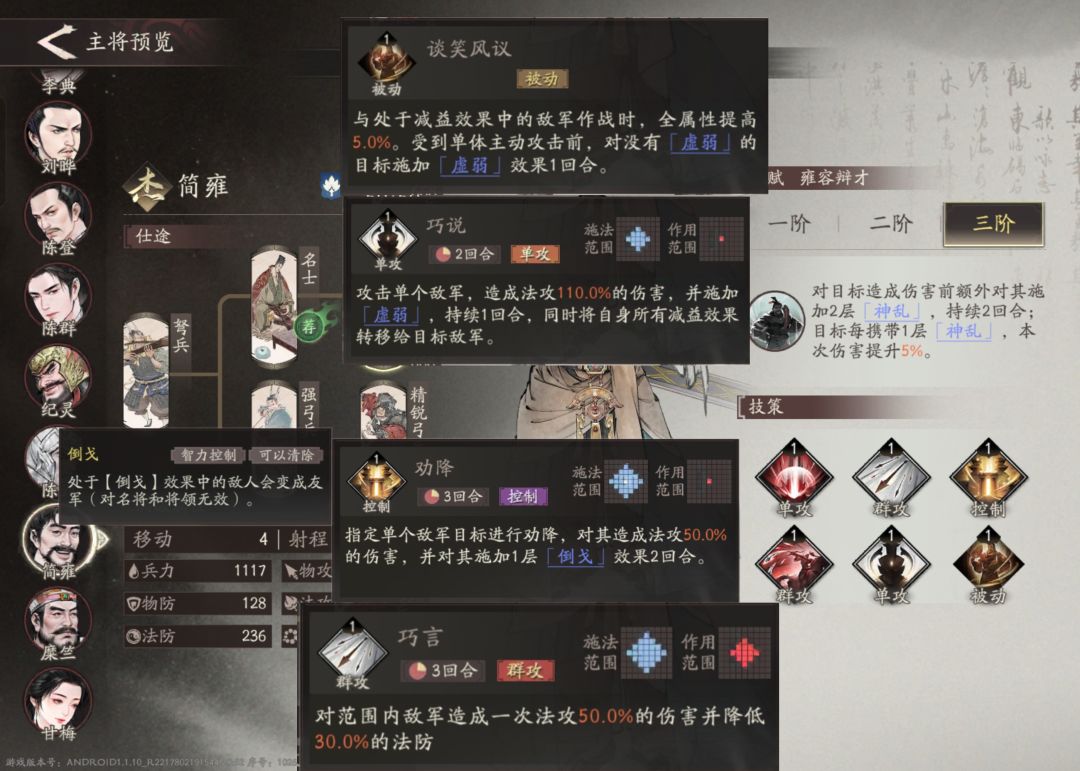 技能推荐:其实简雍的辅助效果不弱,技能搭配天赋可以让敌方全程处于虚弱状态,并且还有30%的法抗降低。不过因为技能栏有限,还是娱乐主将,所以技能搭配也没有太多限制。这里推荐巧言 ,巧说,劝降,谈笑凤仪里面四选三。不带劝降的话,简雍也算一个比较强的法辅了。