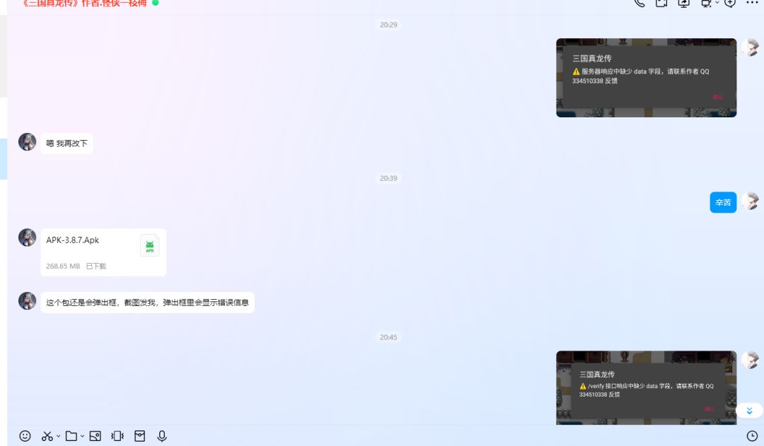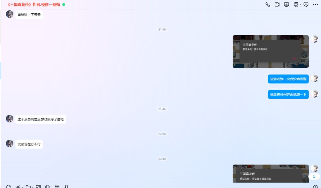 今天我更新游戏之后一直有弹窗玩不了游戏,我抱着试试的态度联系作者,没想到作者特别有耐心,问我什么情况,告诉我该怎么做,没想到还是不行,作者就临时修复,休啦好久终于修复好了,特别感谢作者,特别有耐心,而且回复特别快。