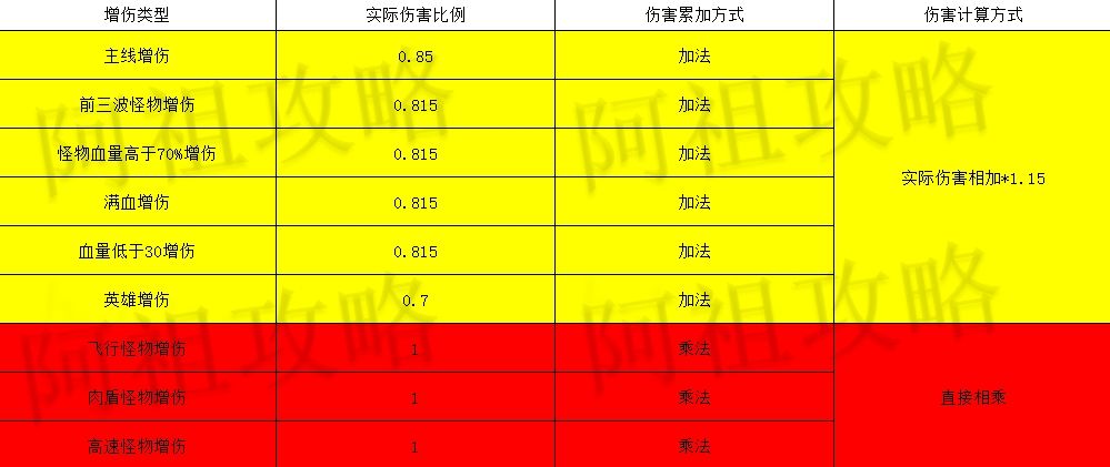 大家看图中我标注的黄色增伤,也叫加法增伤,在衰减之后,多种增伤相加,再整体乘以1.15,就是实际增伤了。