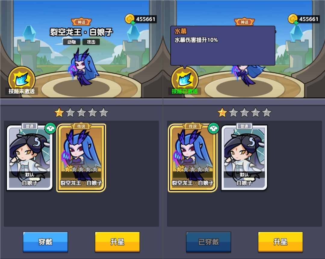 譬如上图中,白娘子穿戴“裂空龙王·白娘子”的皮肤后,将使水幕技能伤害提升10%。