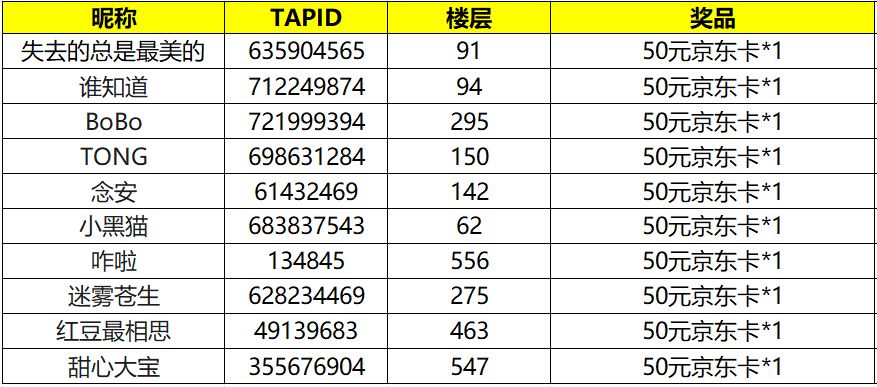 恭喜上述中奖玩家!请获奖玩家关注并私信联系小旋风,发送自己的中奖评论楼层截图,小旋风会在8月21日前查看并回复确认登记,将在30个工作日内通过TapTap私信为您发放京东卡奖品,请您耐心等待~