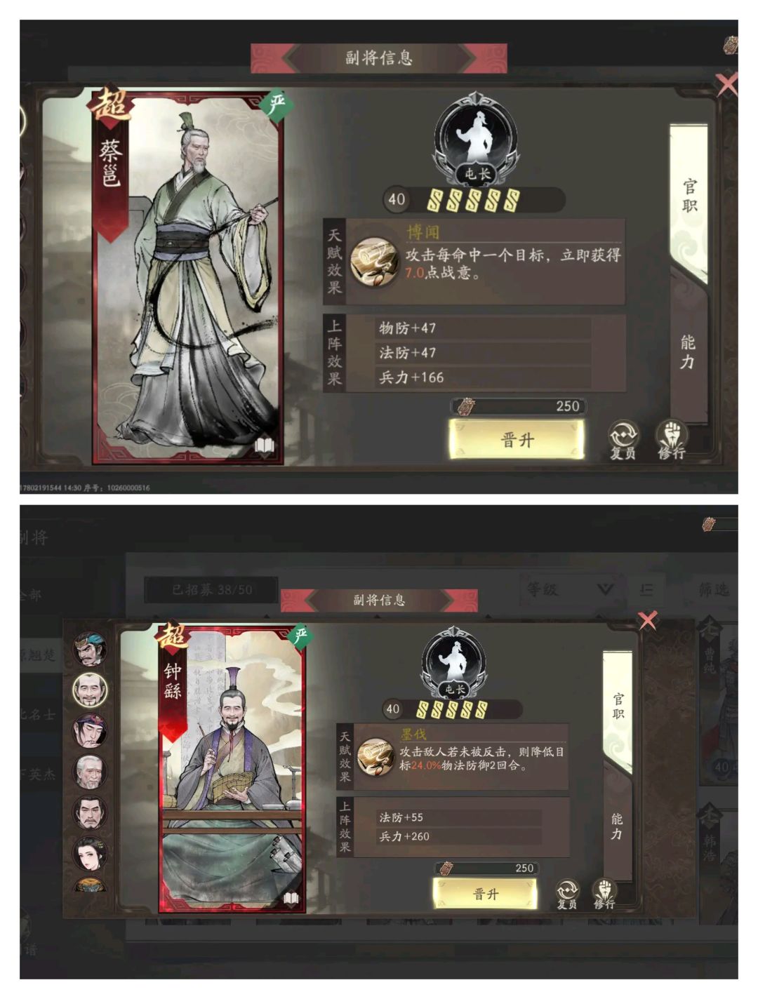 副将推荐:因为程昱的双法可以全程替换为法攻,所以法攻数值对程昱几乎完全没用。考虑这点的情况在前期可以选择曹安民,夏侯氏或者邹氏过渡。后期选择钟繇,蔡邕。