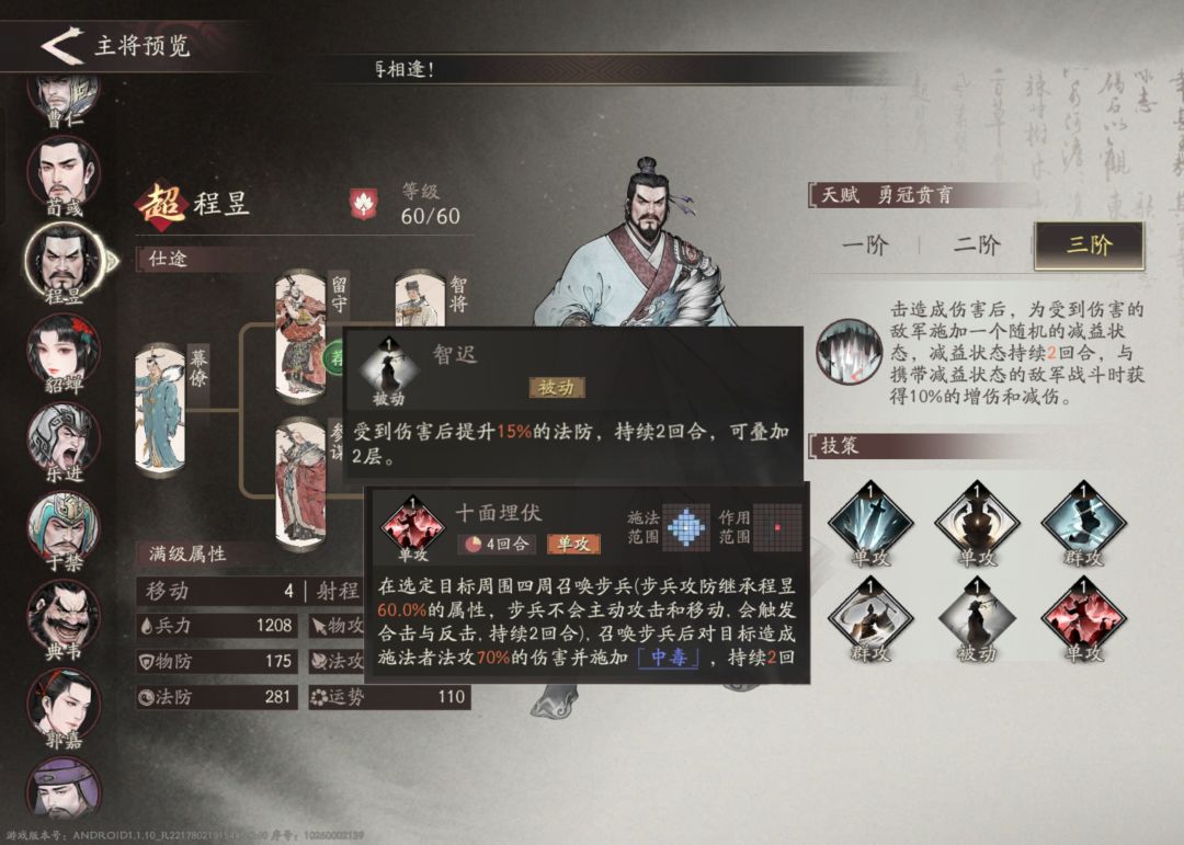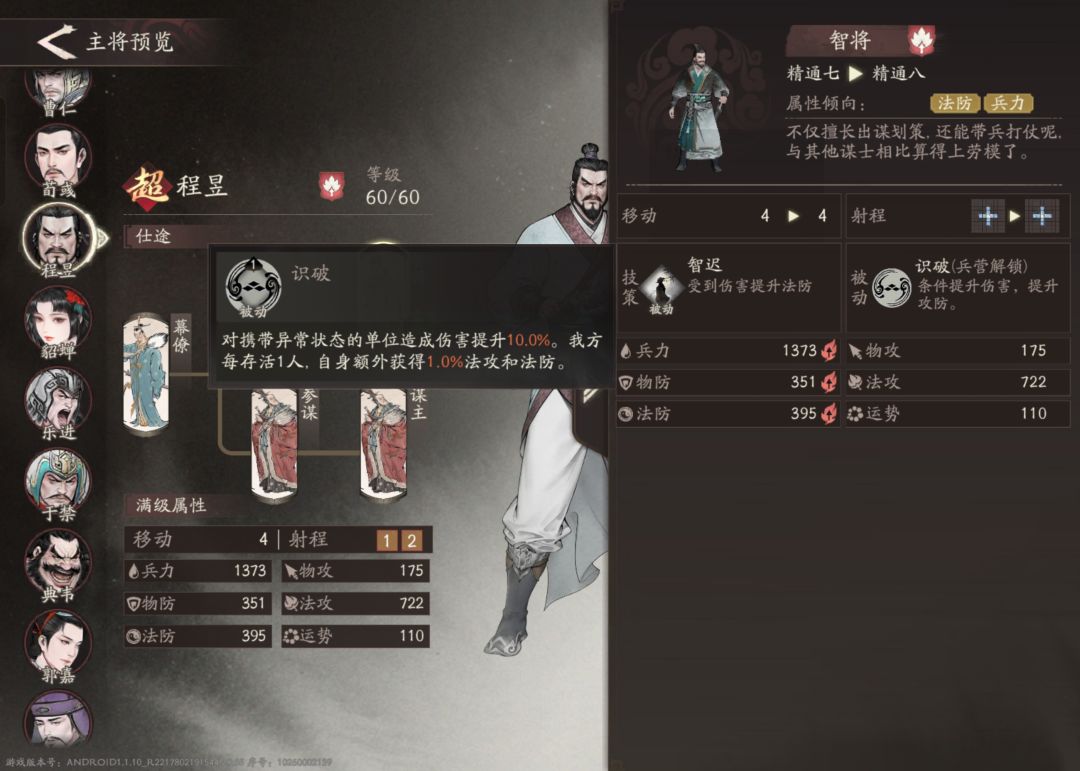 主将介绍:程昱的天赋被动很简单,就是攻击后为敌方附加随机的减益buff,如果用的是技能,那么在释放技能前还能附加一次debuff。并且对拥有debuff的敌人有增伤和减伤。