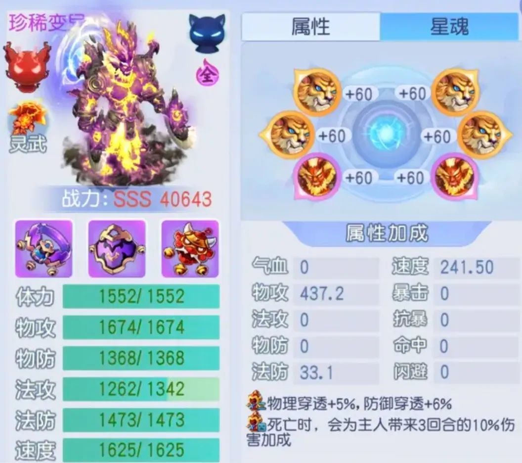 星魂属性为气血、物攻、速度(法防附带),契合宠物需求,但三个紫色品质可升级为橙色以提升属性。套装为九尾×2 + 大圣×2 + 蛮王×2,放弃四件套,追求伤害与物穿双重提升,选择合理。