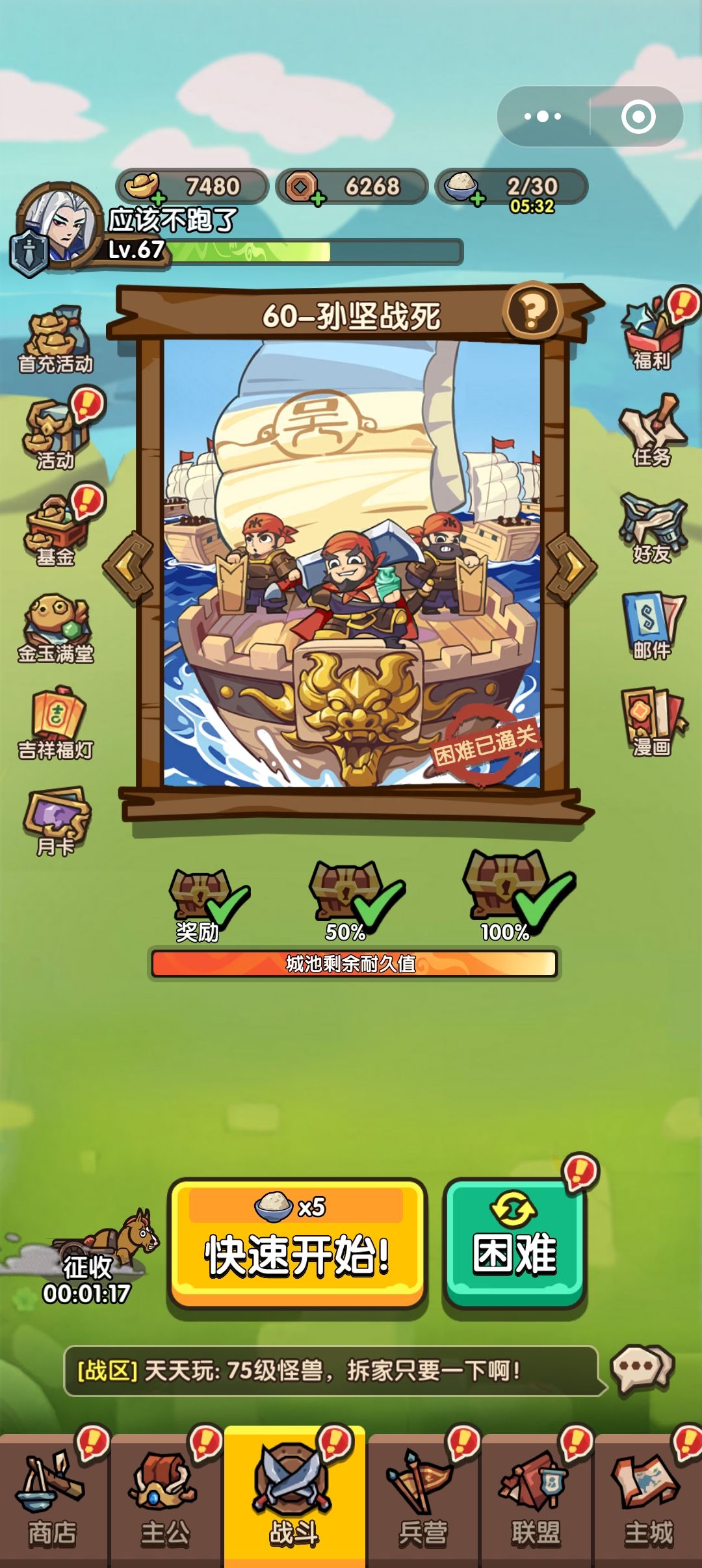 第60关真难,卡了5天,刷了5天。中午今天过了。每次都是8级就死了。最好一次才到boss出来。每次都是5级刷不出来就退。
