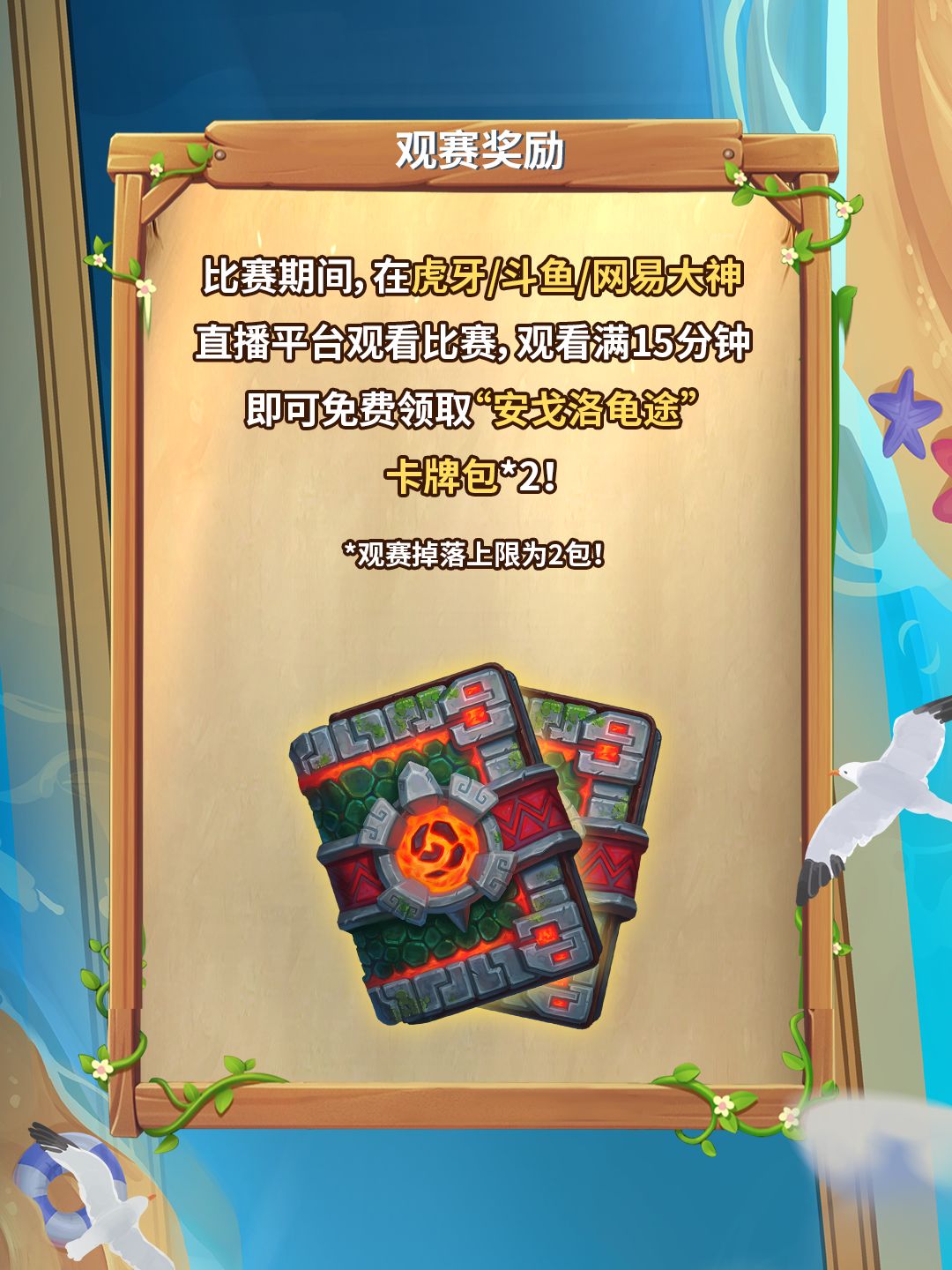 最后,我们为线上观众也准备了丰厚的观赛好礼,在斗鱼/虎牙/网易大神平台观看比赛满15分钟,即可免费获得“安戈洛龟途”卡牌包*2!